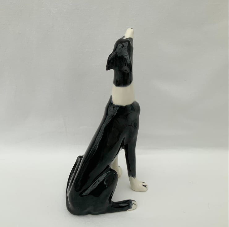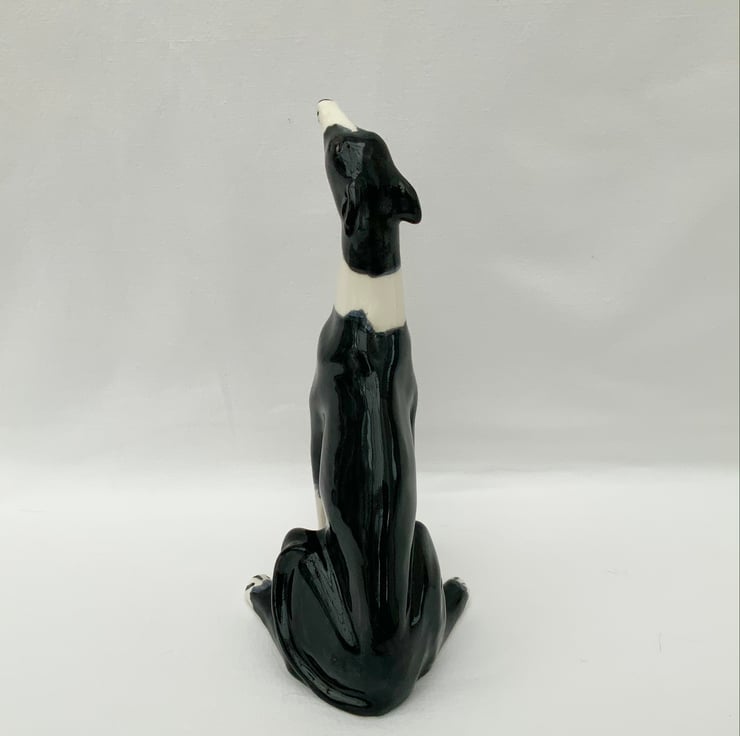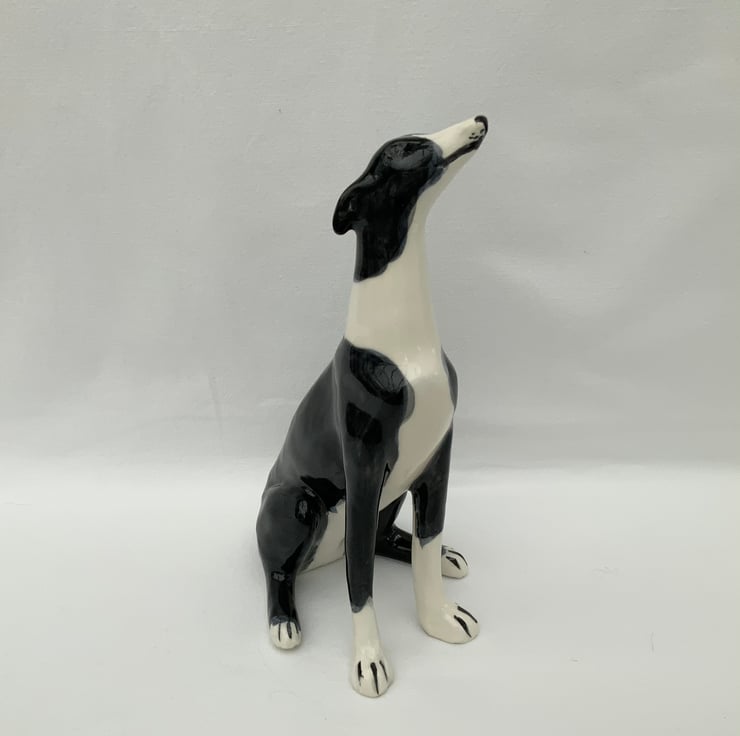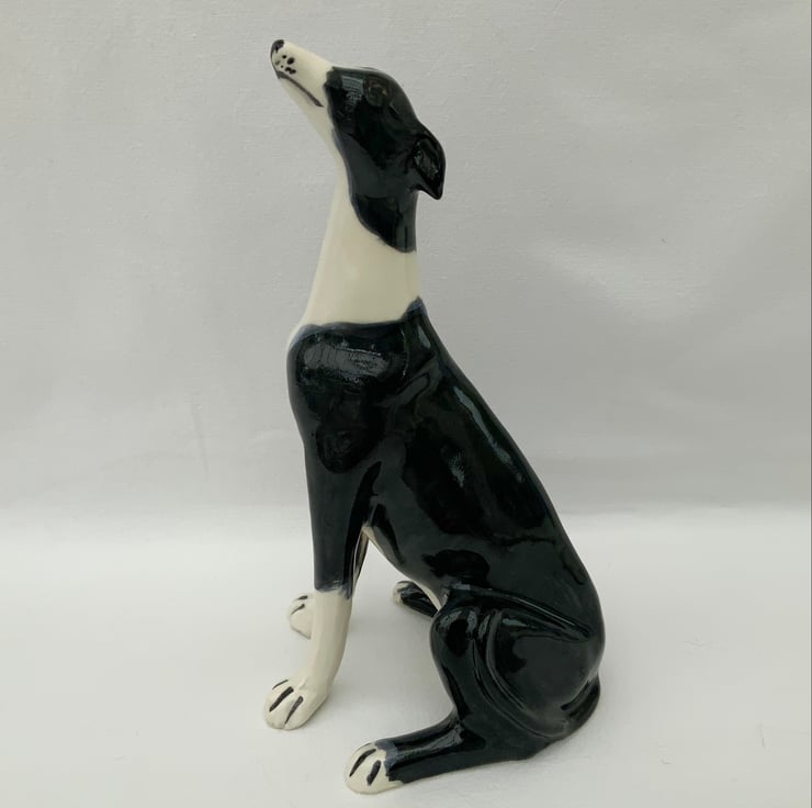 This Black & White Sitting Greyhound is an original hand painted design and I think makes a delightful ornamental figure.