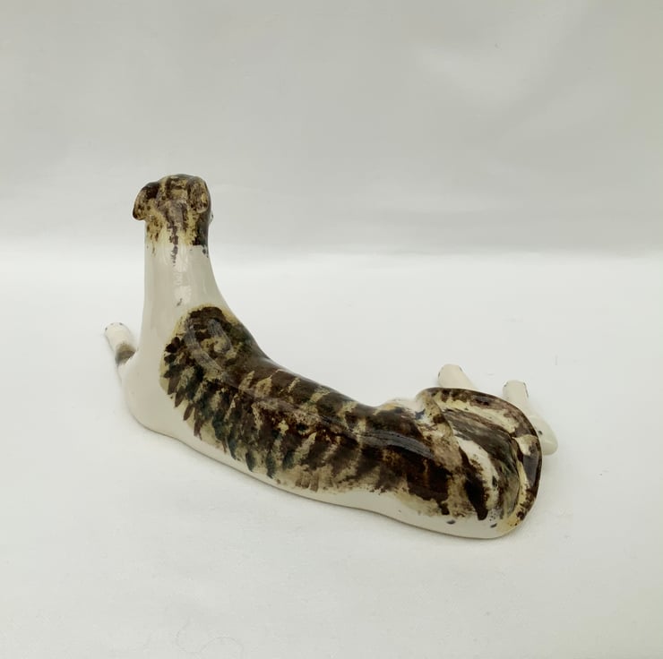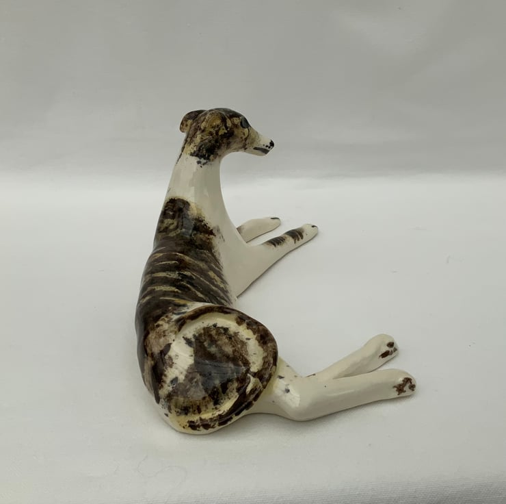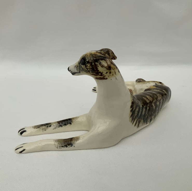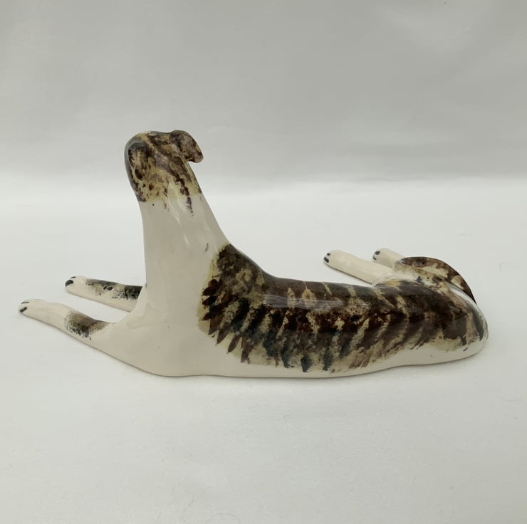 After a bisque firing the I hand paint the laying greyhound with brown, ochre, and white under glaze colours using brushes and sponges to achieve the brindle pattern of a greyhound.