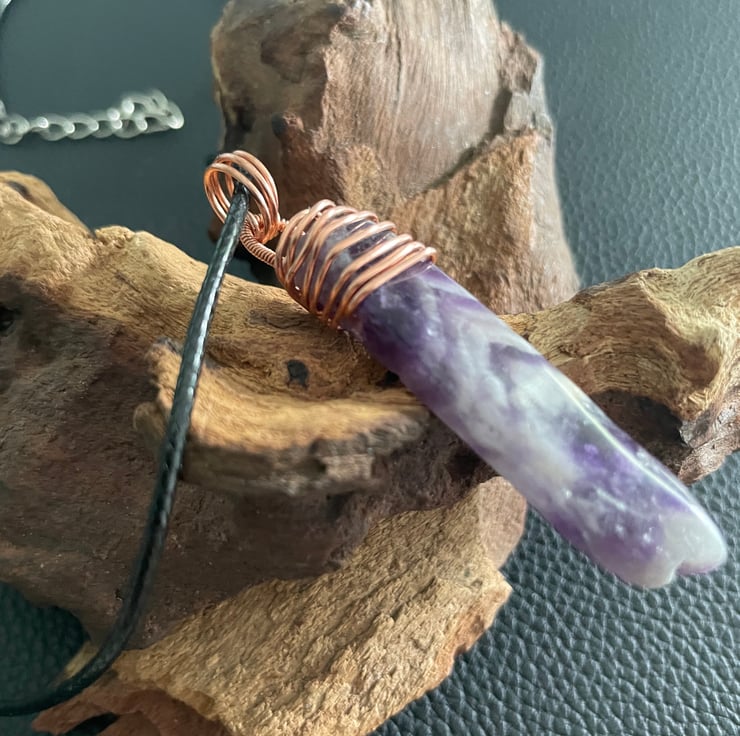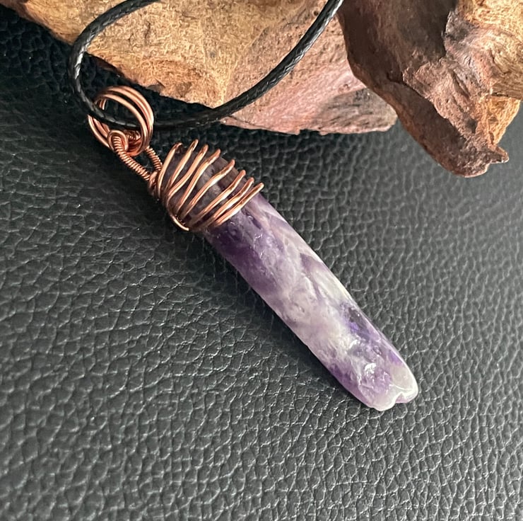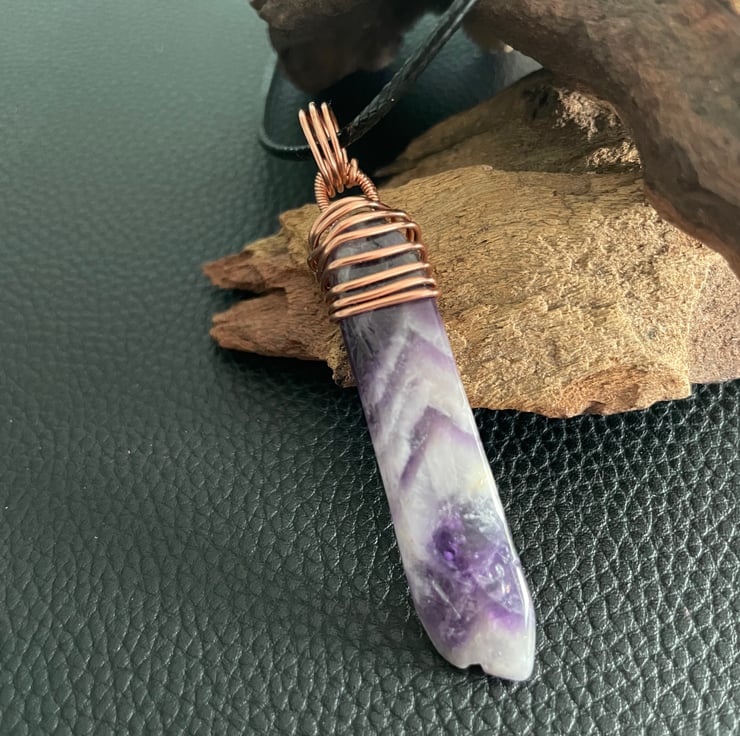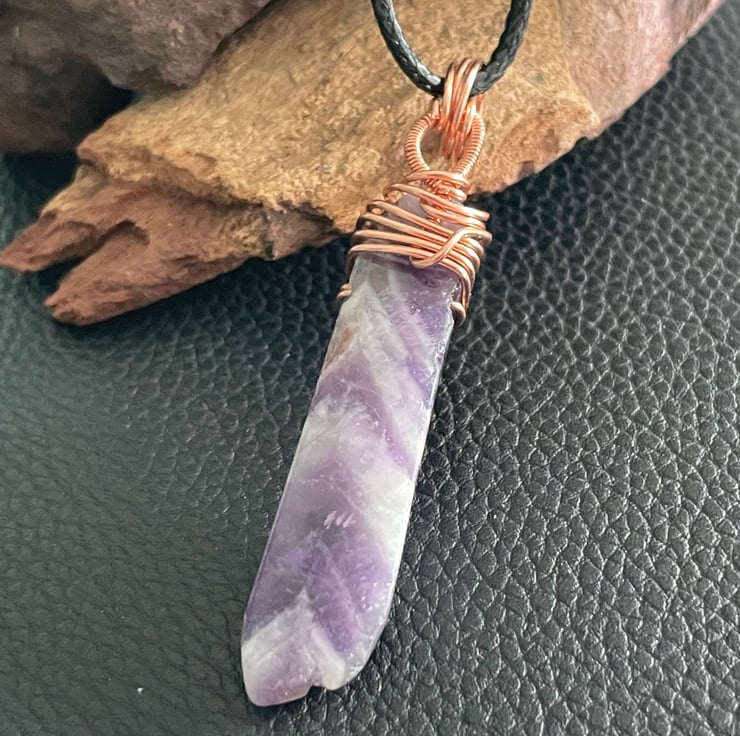 Natural Chevron Amethyst Pendant measures 6cm. Set with a length of bare copper artistic wire and paired with an 18 inch black cord necklace.