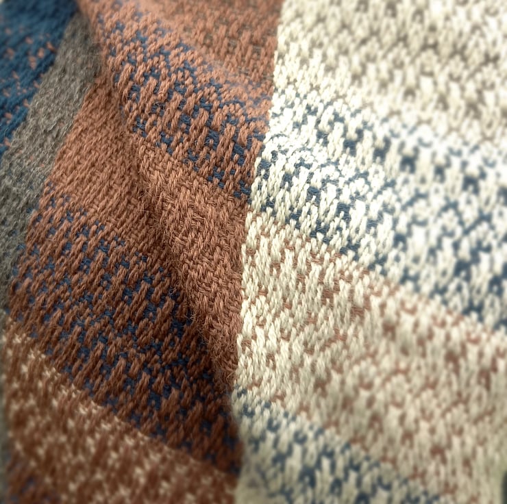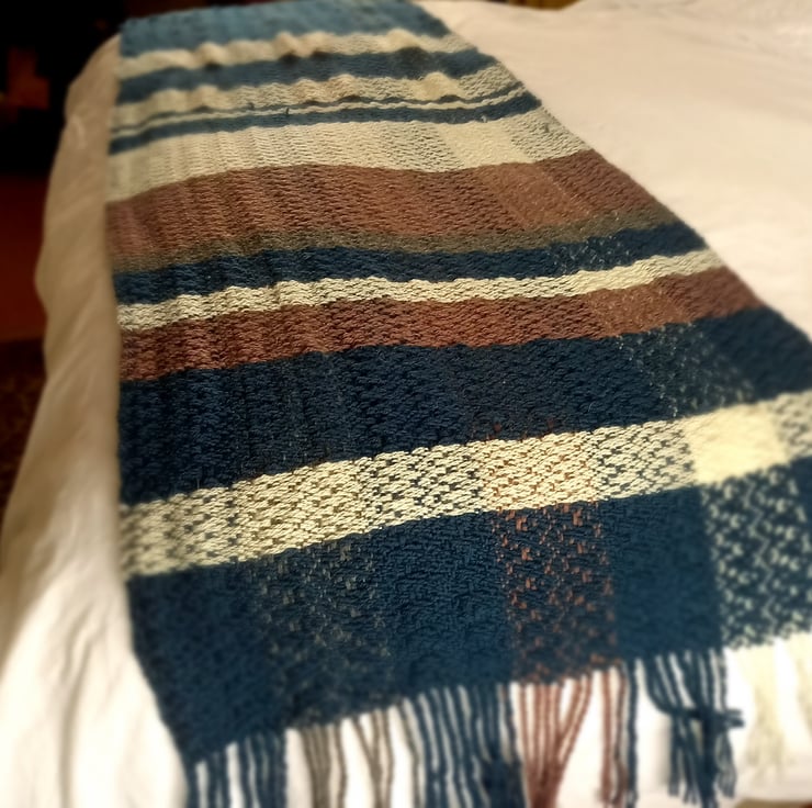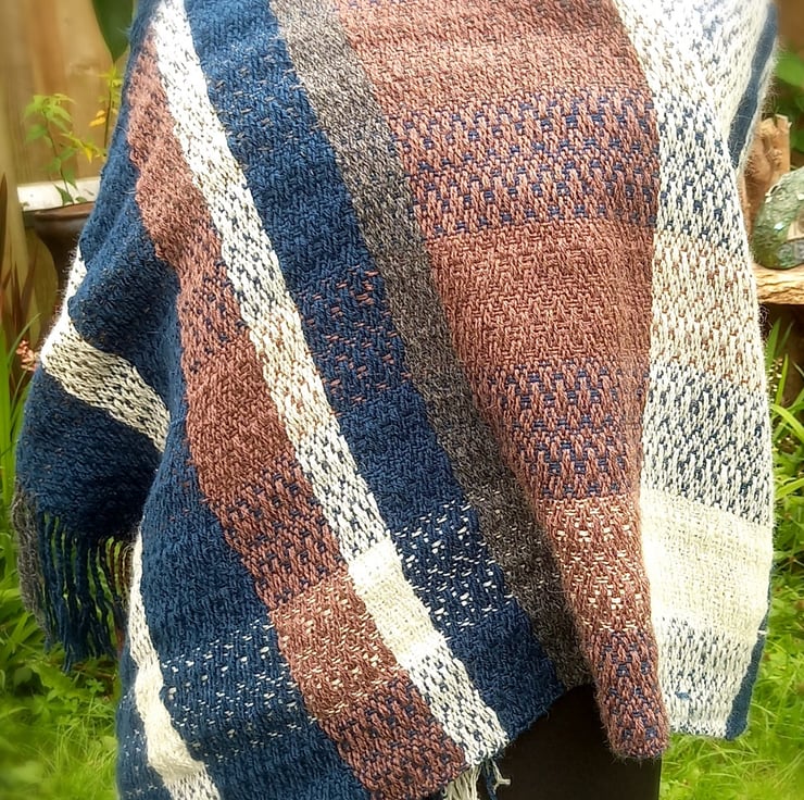 Using a combination of Guernsey wool, Blue Face Leicester and Wensleydale Longwool, this blanket shawl is a beautiful combination of colours and textures. Perfect as a warming shawl or to add as a bedroom throw. Width: 50cm Length: 185cm