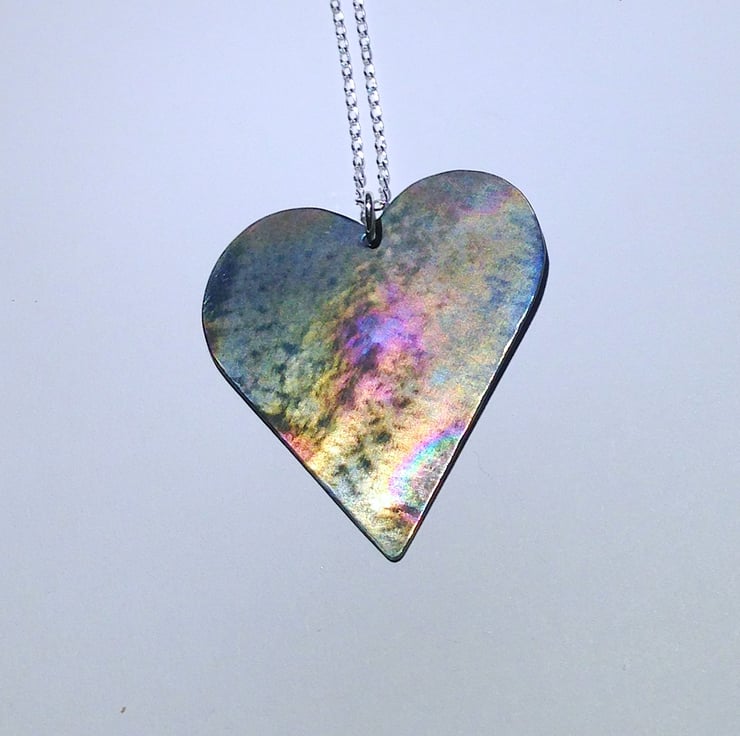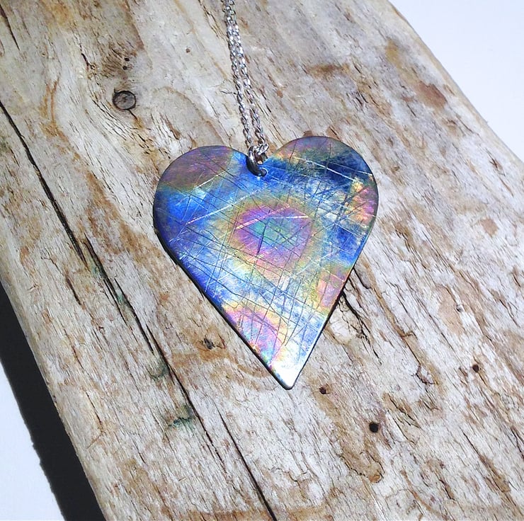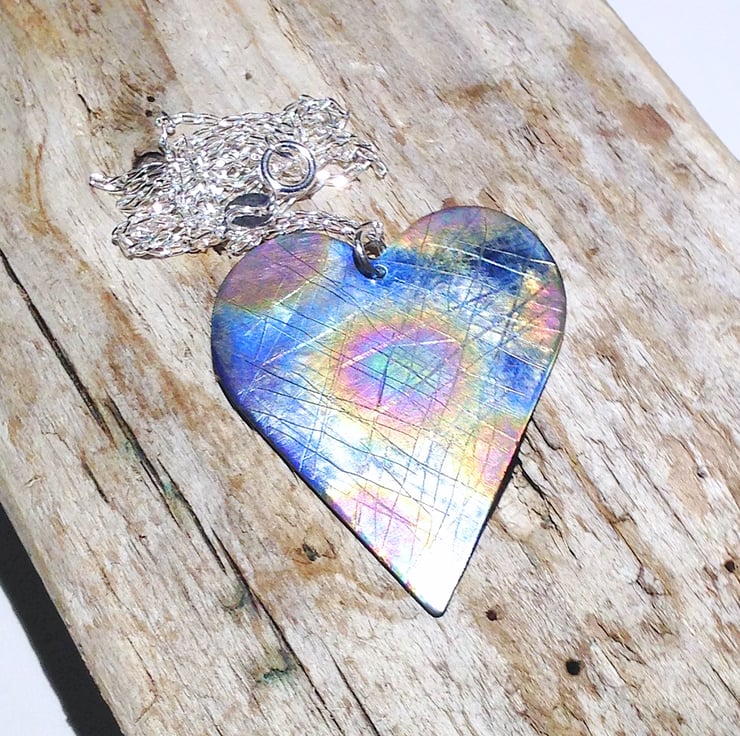 I have hand sawed the heart from titanium sheet before giving each side a different distressed surface finish and colouring to create a unique piece.