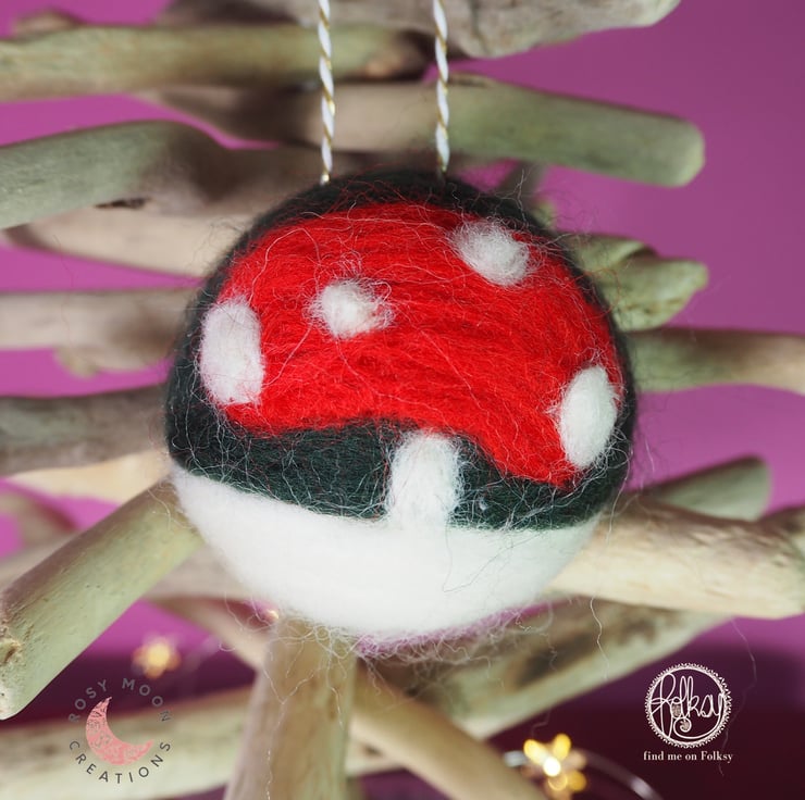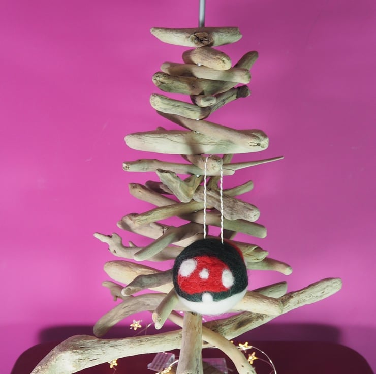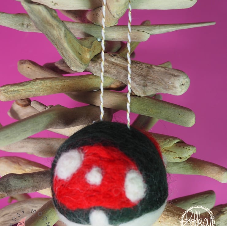 This toadstool Christmas bauble has been handfelted using wool felt onto a lightweight ball and is hung using a gold and cream twine. The bauble measures 7cm and the twine measures 7cm in length.
