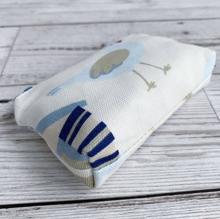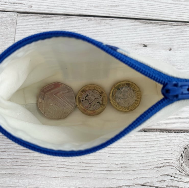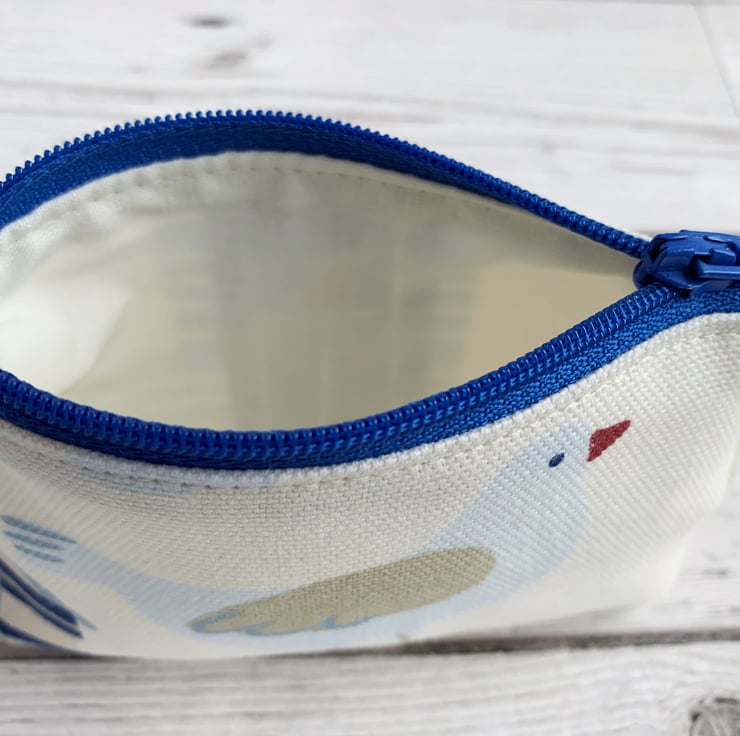 A small coin purse with a seagull. This handy small coin purse is made from delightful seaside print fabric and features a seagull in nautical shades on a cream background. The seagull is pale blue with a beige and blue wing, beige legs and a red beak. The coin purse has a royal blue zip and is lined with cream fabric. The base of the purse is boxed to give more space inside.