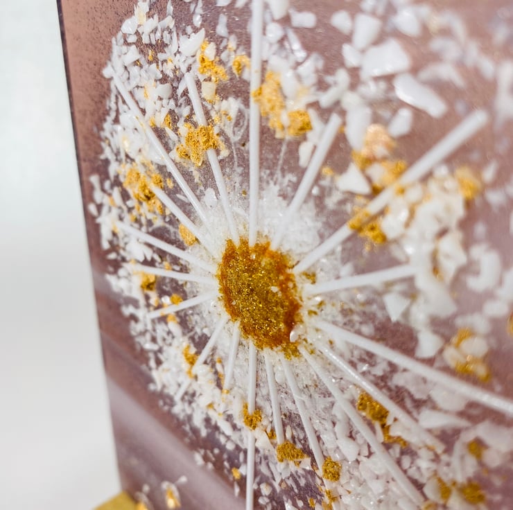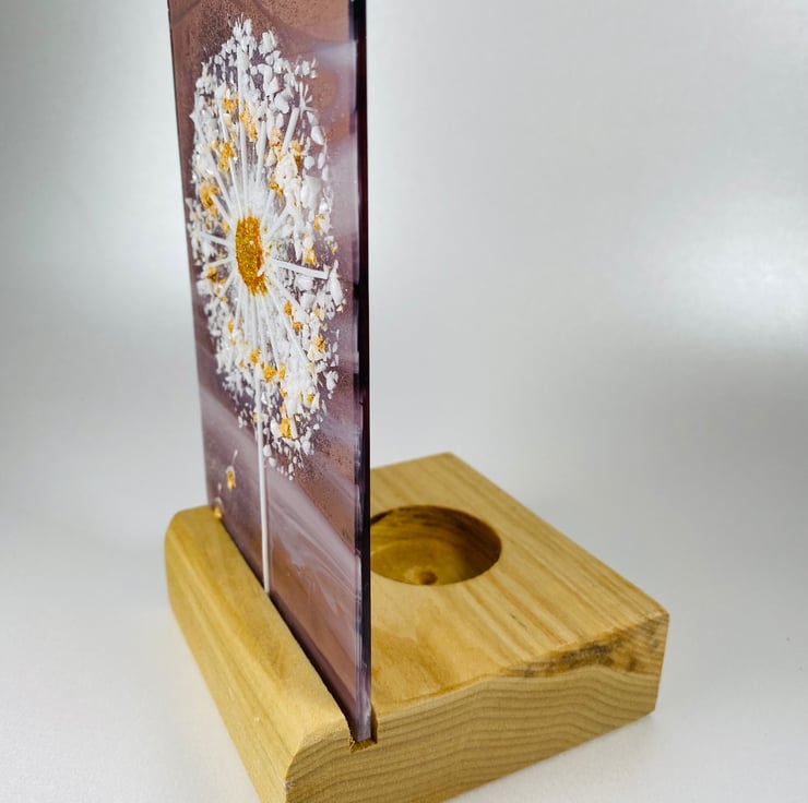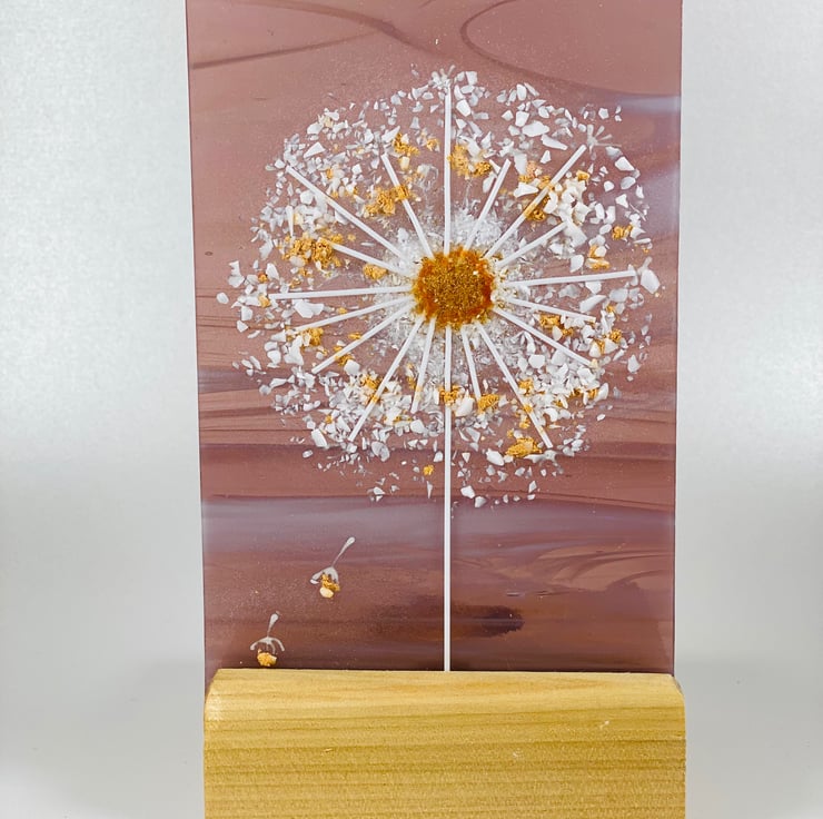 Gorgeous wispy mauve glass with delicate all glass and gold and copper mica in this pretty dandelion . Stunning art piece when land duels as a candle holder by evening for a unique look . The hlass art panel slots out on the oat base for sending and for cleaning . The glass is textural