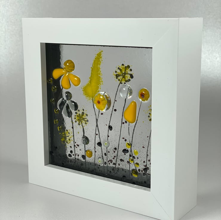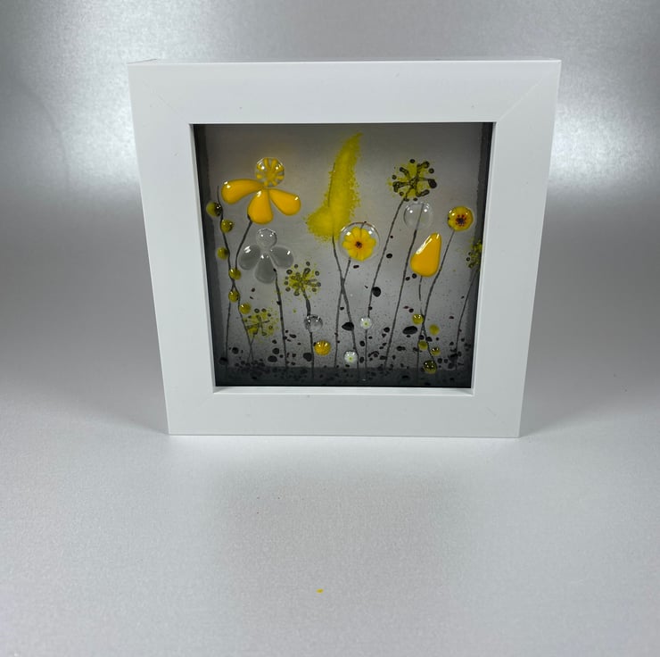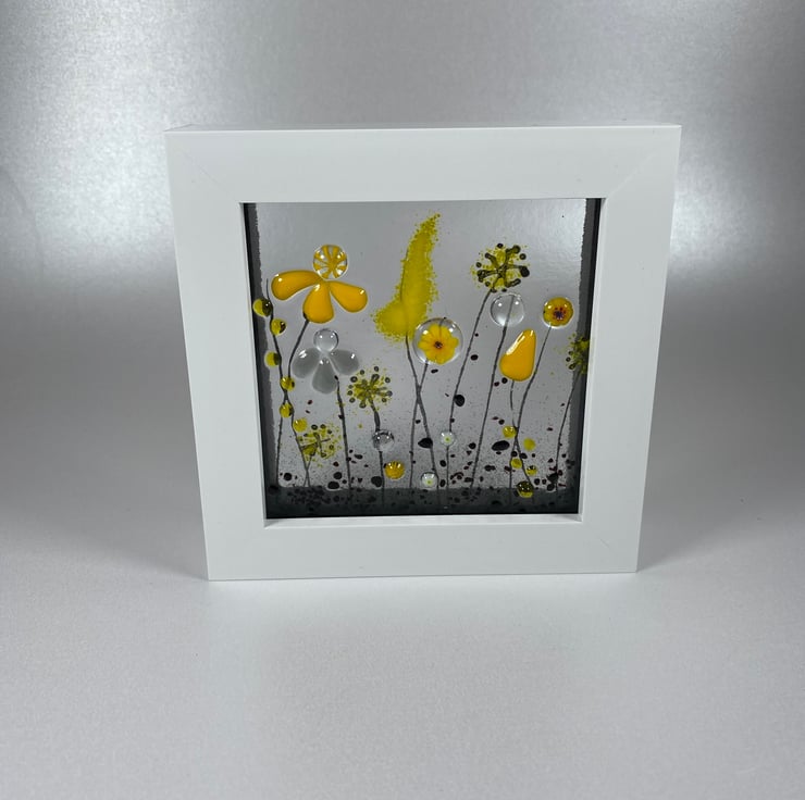 Pretty fused glass mini meadows picture 13 cm square. The frame can be freestanding or wall mounted and can be displayed with or without the back on . Tiny murine sunflowers are featured in this piece. There are 3 different designs in this range and they look lovely together
