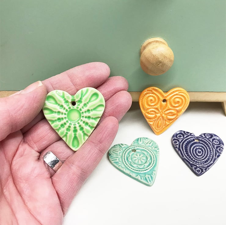 This set of four heart shaped pottery pendants are made from white earthenware clay, embossed and glazed in a variety of rich glossy glazes on the front only. They are then fired to 1100 degrees, so nice and strong. They measure 3.5cm x 4cm.