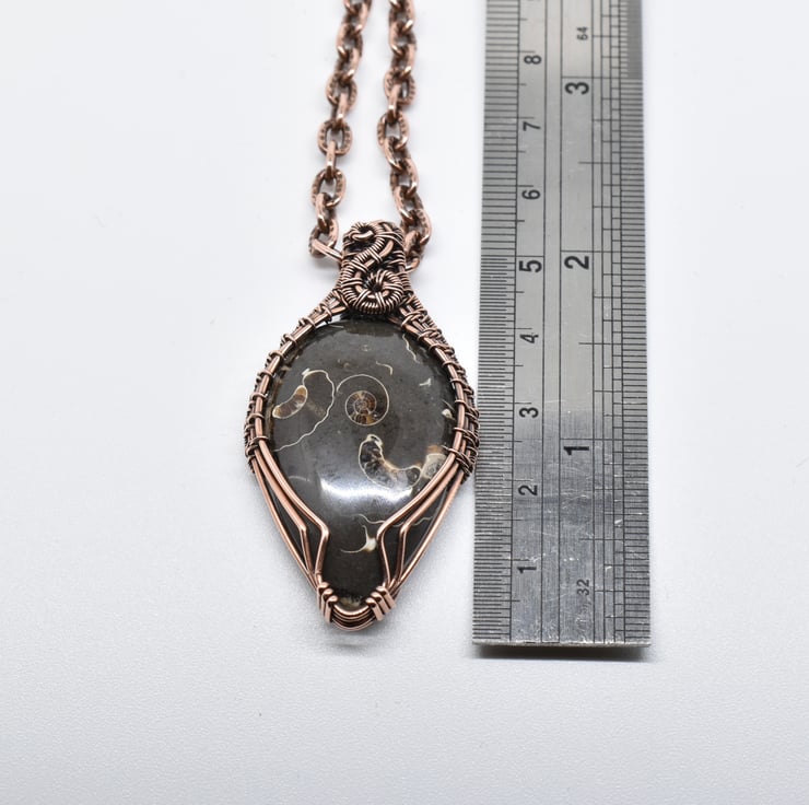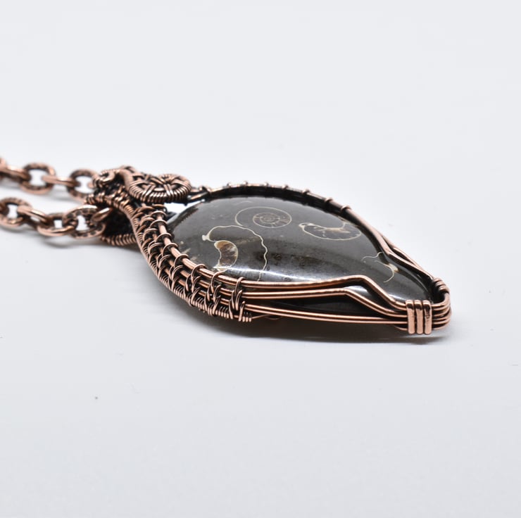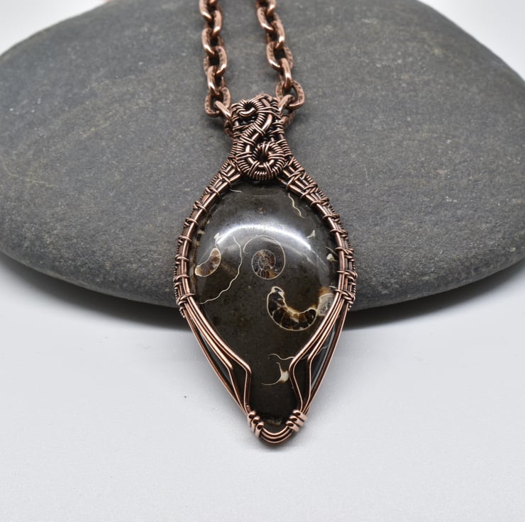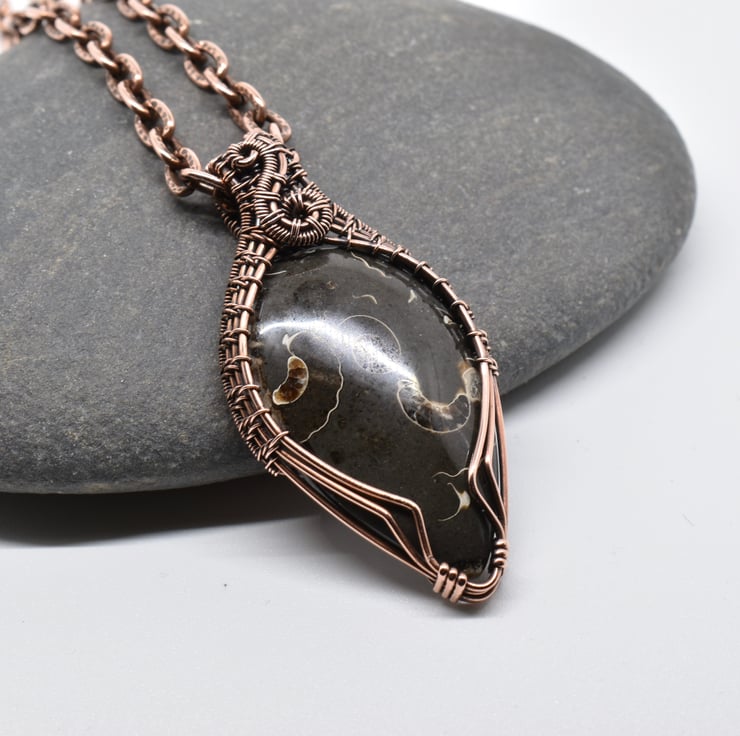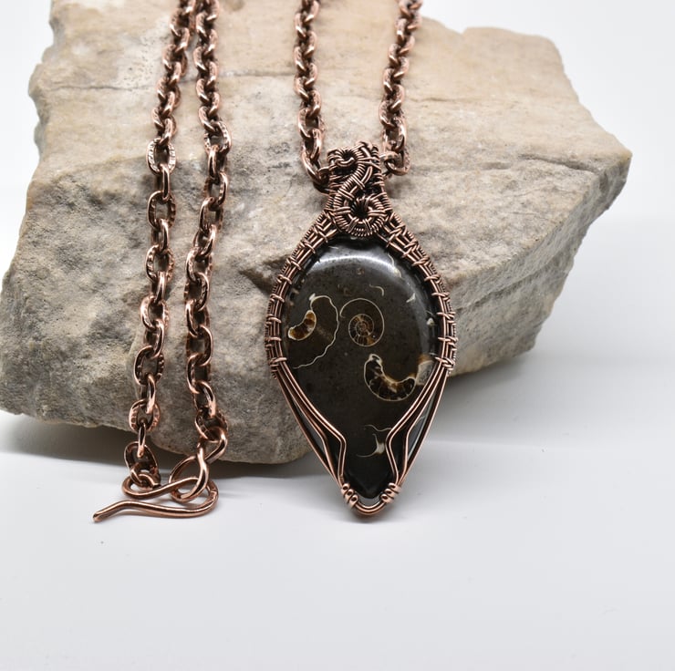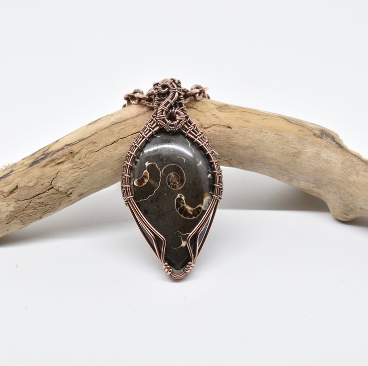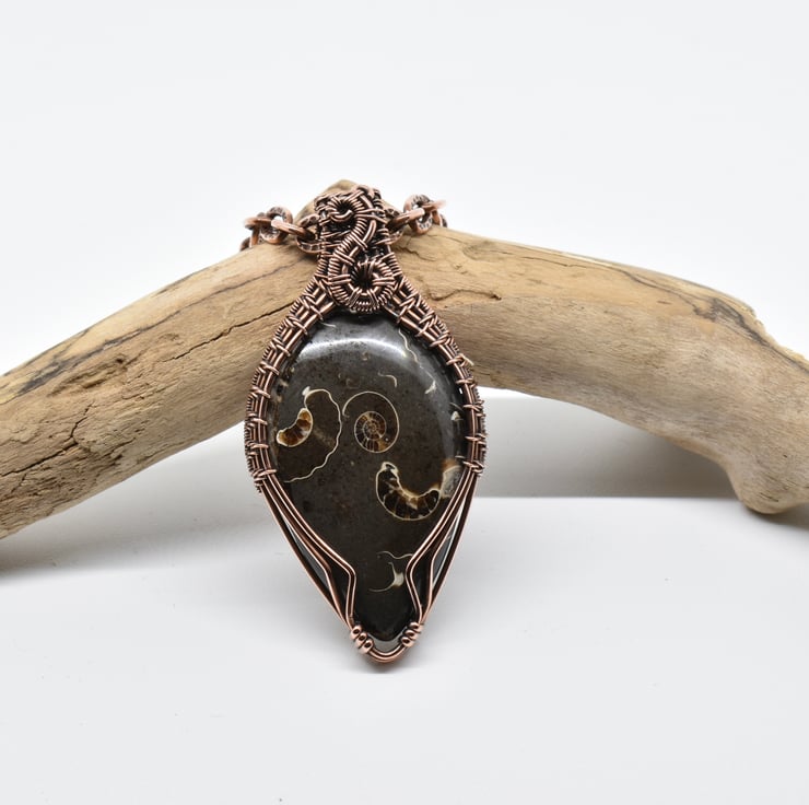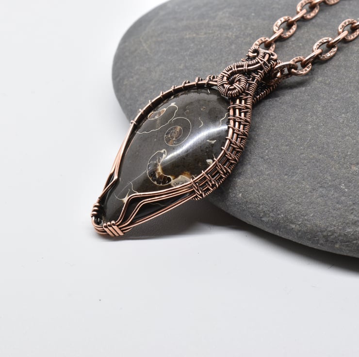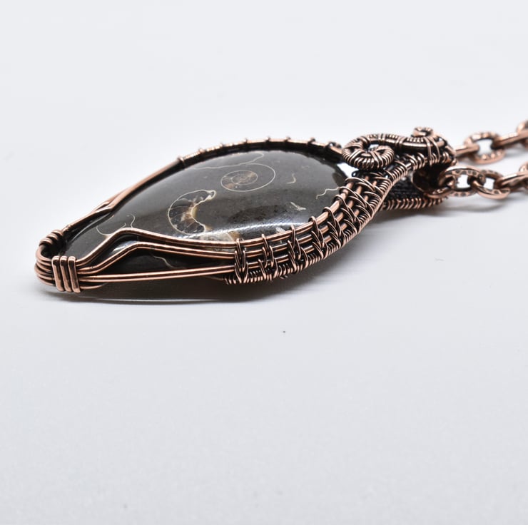I have wrapped and woven the setting for this beautiful fossil using solid copper wire to make this unisex pendant.