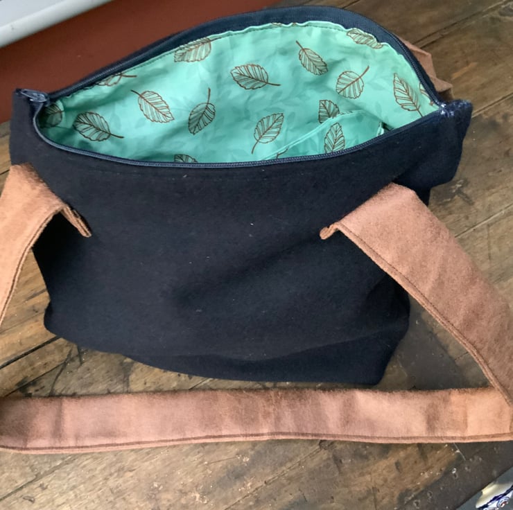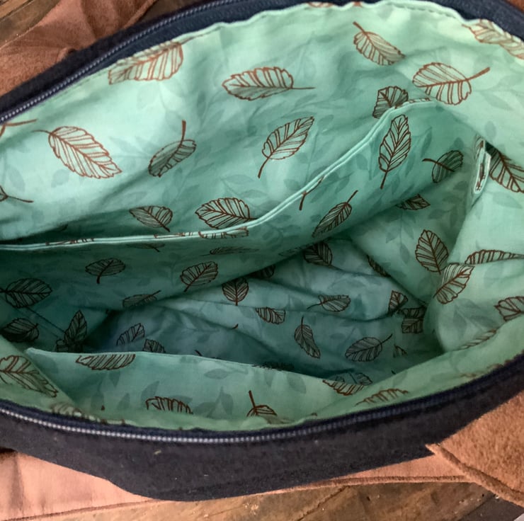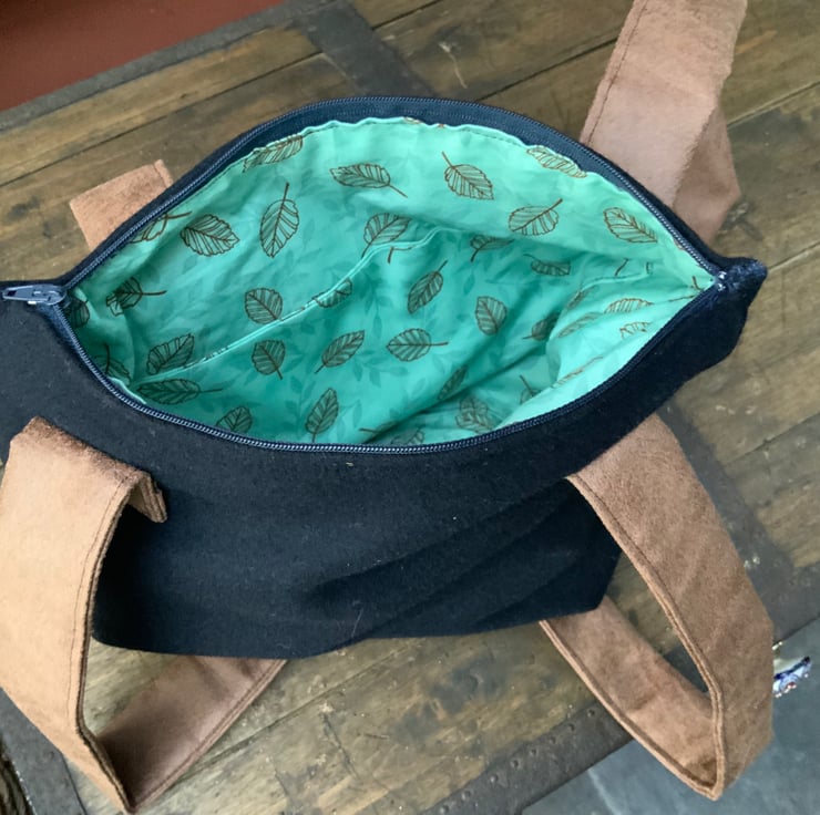 Fully lined with Green leaf fabric. One inside pocket. Zip closure.