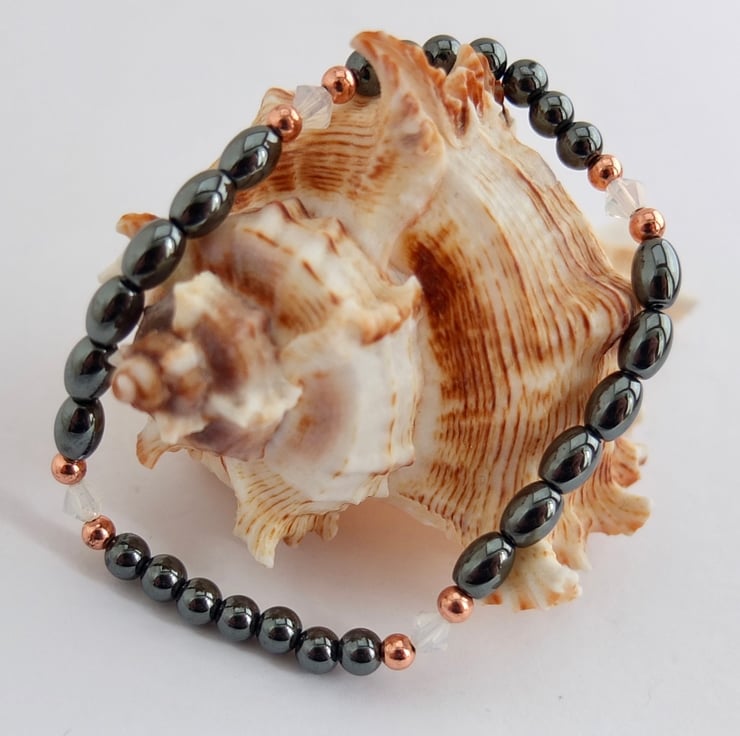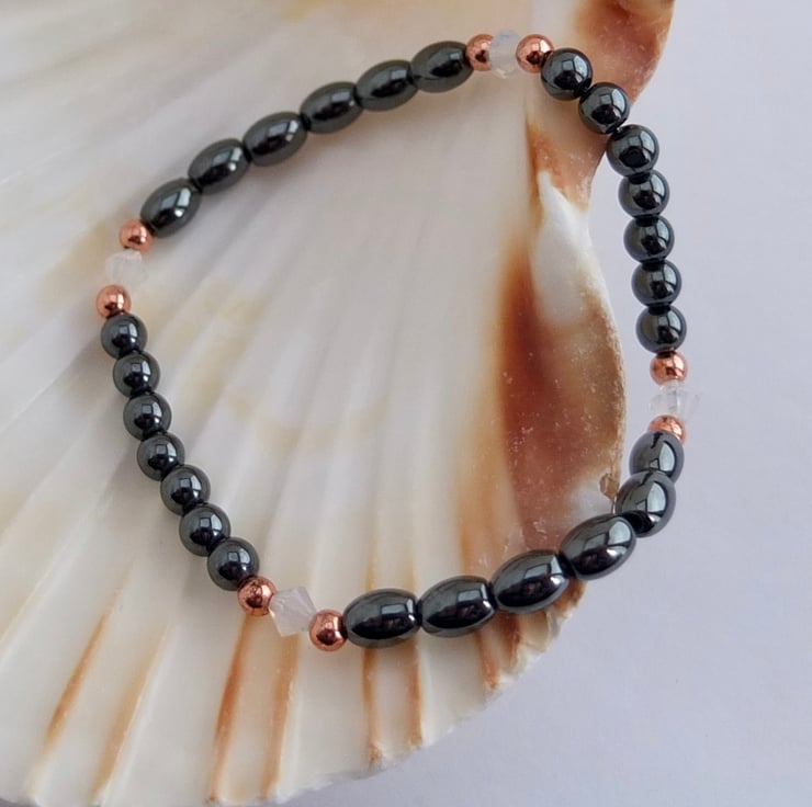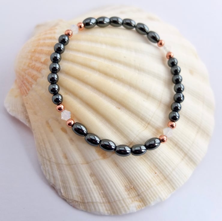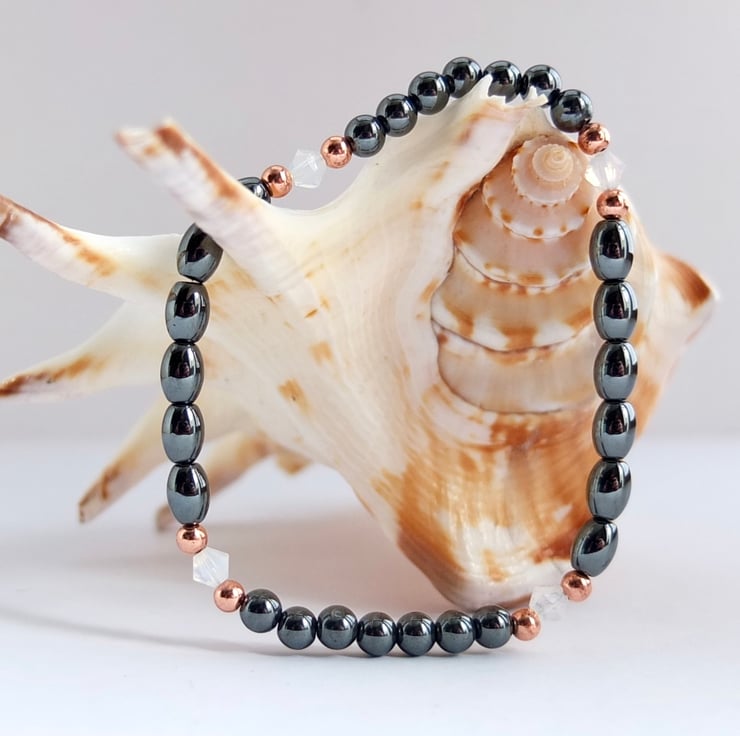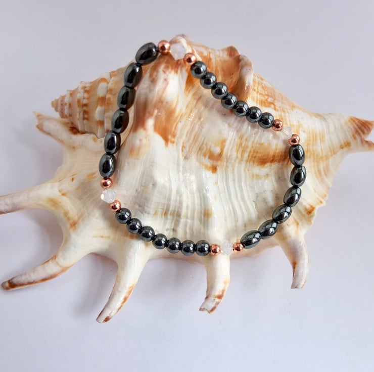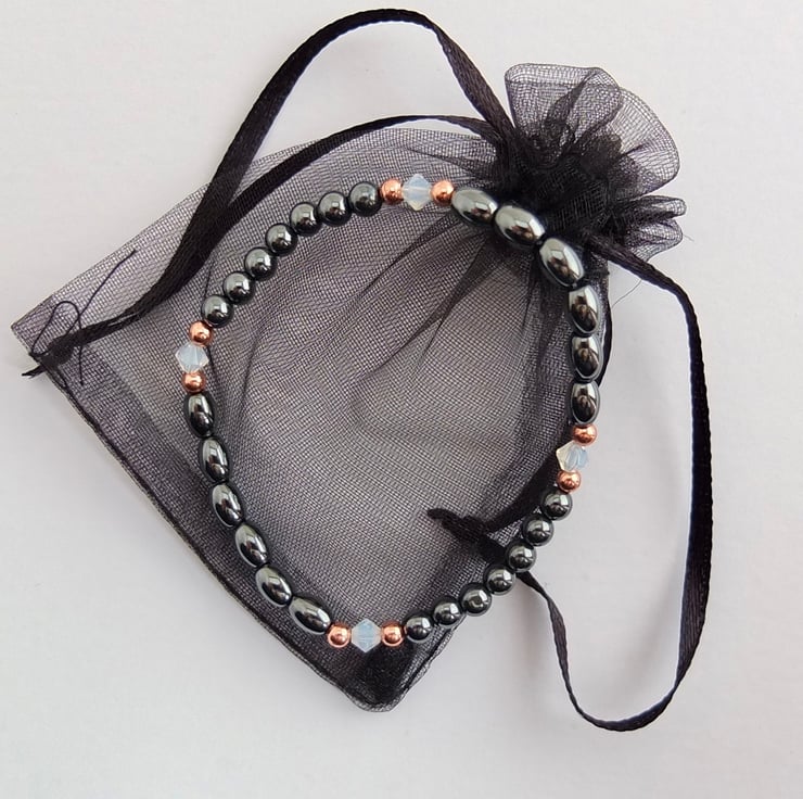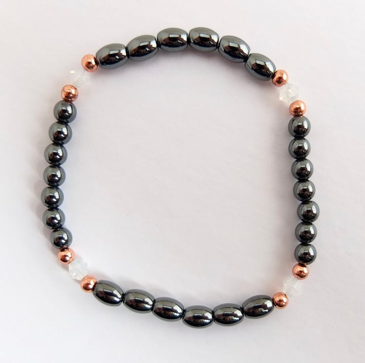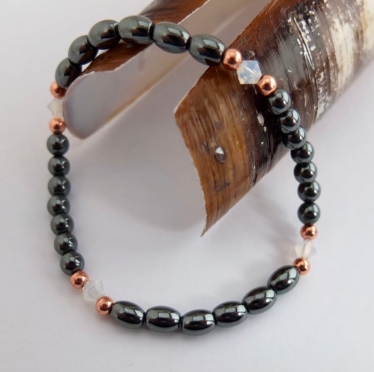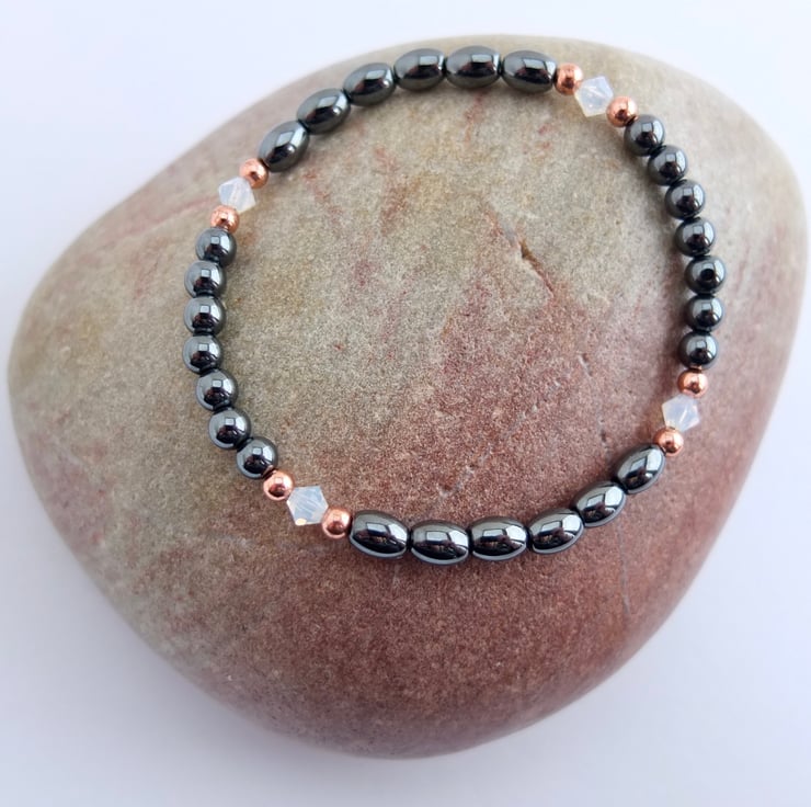 Sparkly Swarovski crystals in a colour called "white opal" are outlined with small solid copper rounds and placed between shiny hematite oval and round beads.
