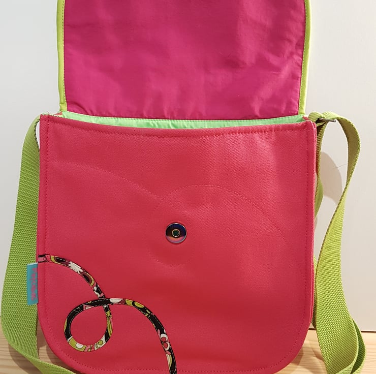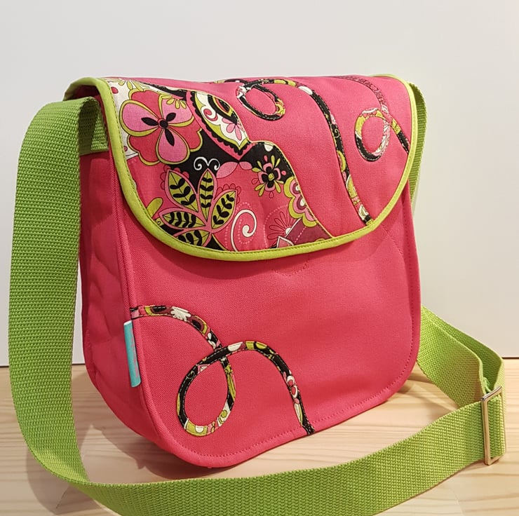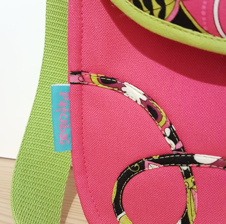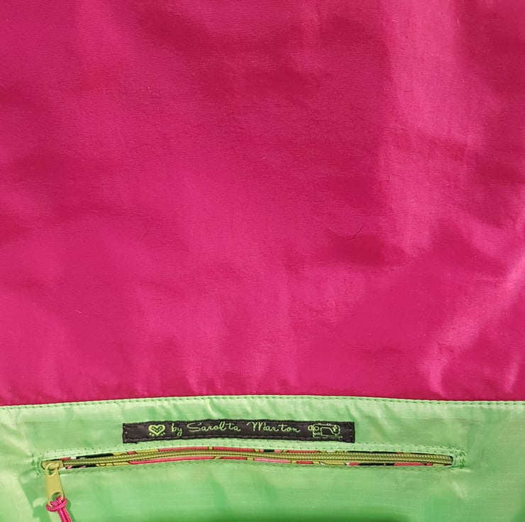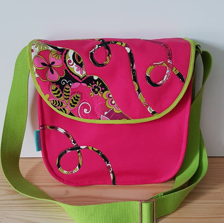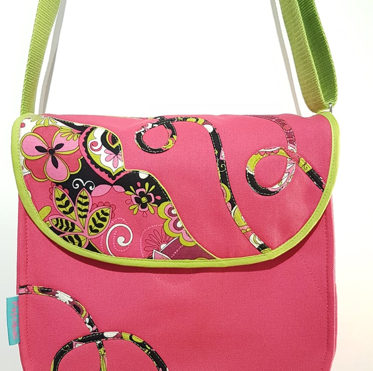 Handcrafted shoulder bag/ crossbody bag with patchwork and applique techniques in beautiful fuchsia pink and lime green patterns. The bag made from cotton canvas and cotton fabrics, the lining of the bag made from waterproof fabric.The bag has magnetic closure and inner pocket with zipper closure. The shoulder strap's lenght is adjustable,can wearing as a shoulder bag or as a crossbody bag. Dimensions: width 25cm, hight:23cm,depth: 7cm on the bottom of the bag.