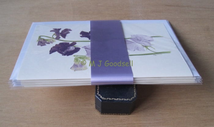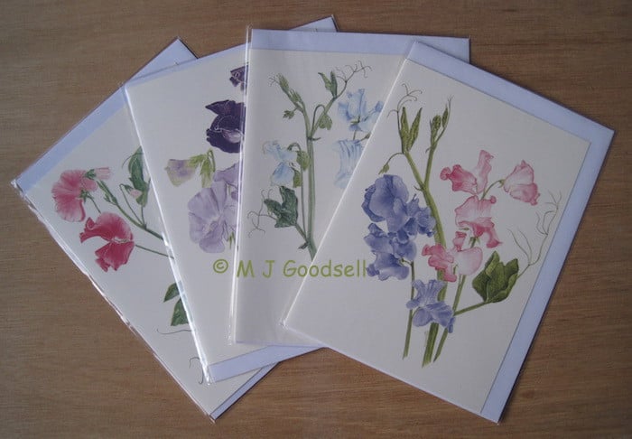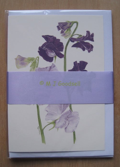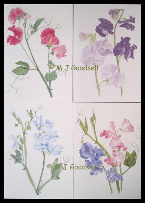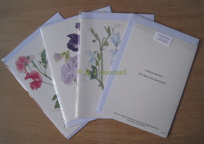 A set of four A5 greeting cards of sweet peas printed on extra heavy pale cream card stock. No message inside. Each card is supplied in cellophane sleeve with good quality 'peel & seal' envelope, attractively presented to make a desirable gift.