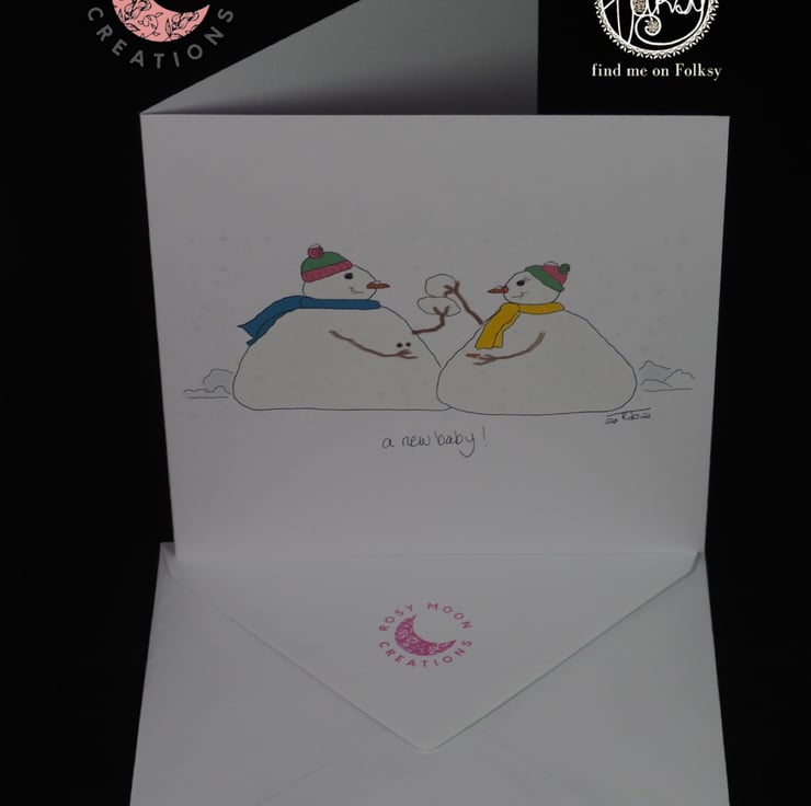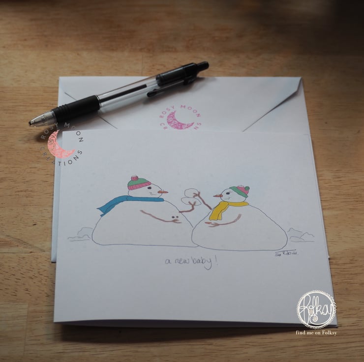 A hand drawn 17x17cm New Baby card which is blank on the inside for your own special message and comes with an envelope.