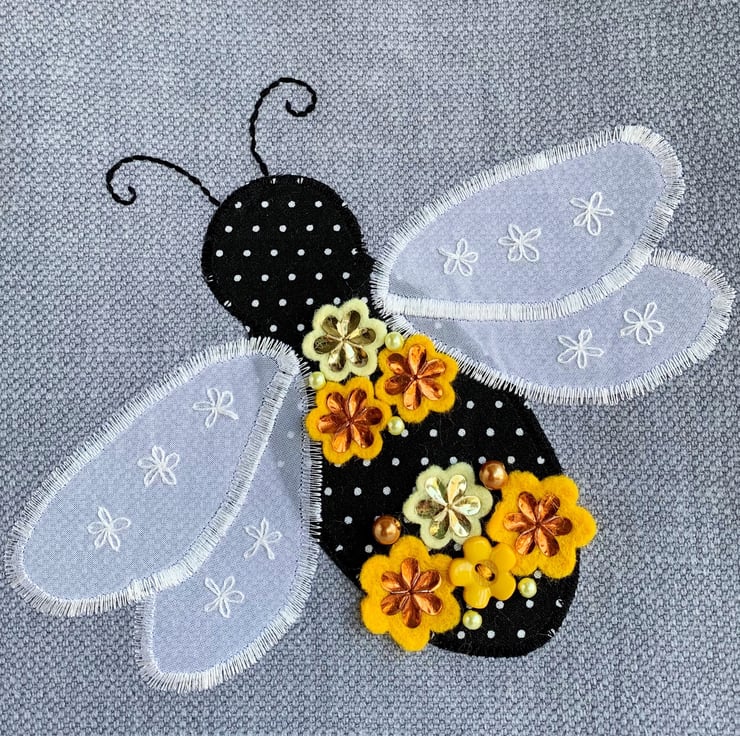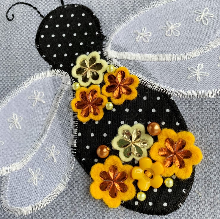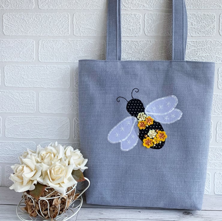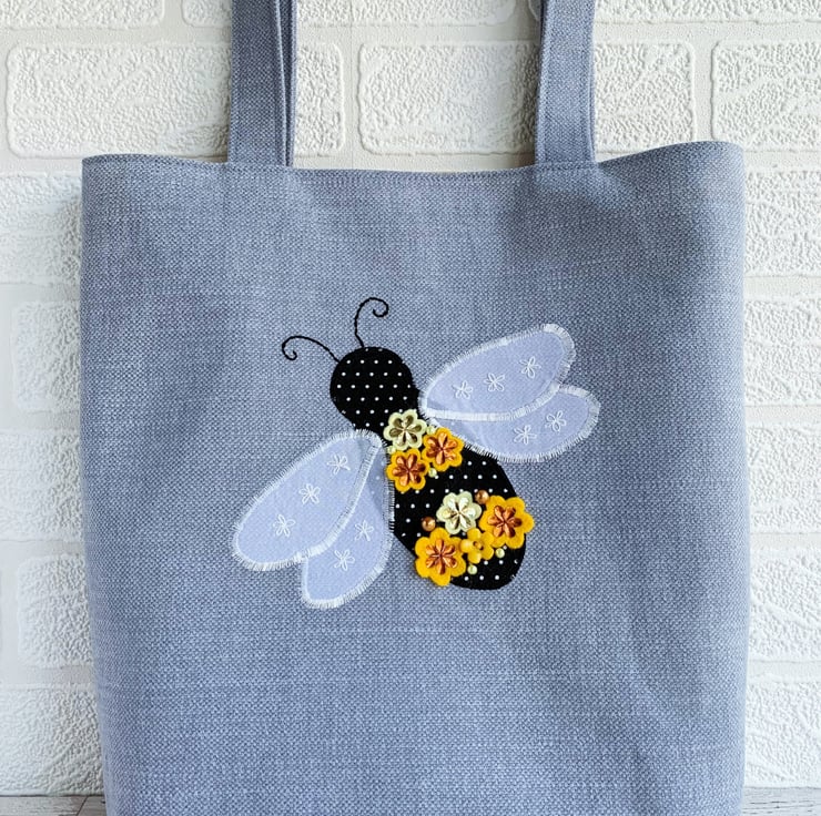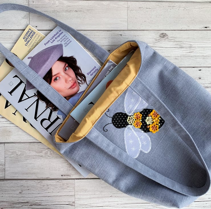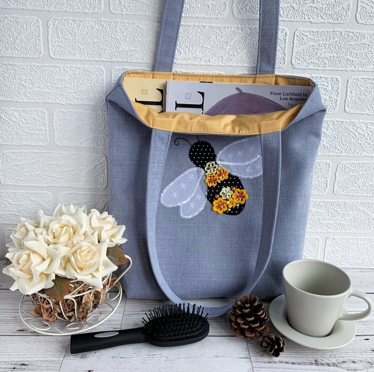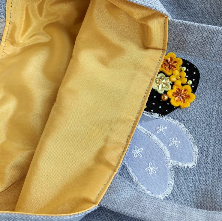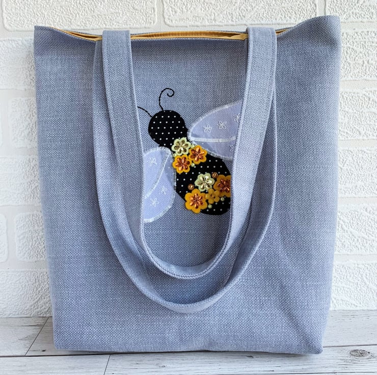 Bee tote bag with floral bee. This lovely tote bag is made from sturdy pale blue fabric with an appliqué bee. The bee is made from black fabric with white polka dots and has hand-embroidered antennae. Its wings are made from white voile on which I've hand-embroidered white lazy daisies. I've made the bee's stripes by adding hand-stitched embellishments including felt flowers in two shades of yellow, topped with gold and copper coloured flower-shaped sequins. I've also added a scattering of faux pearl beads in yellow and caramel. The bag is lined with golden-yellow fabric with a lovely sheen.