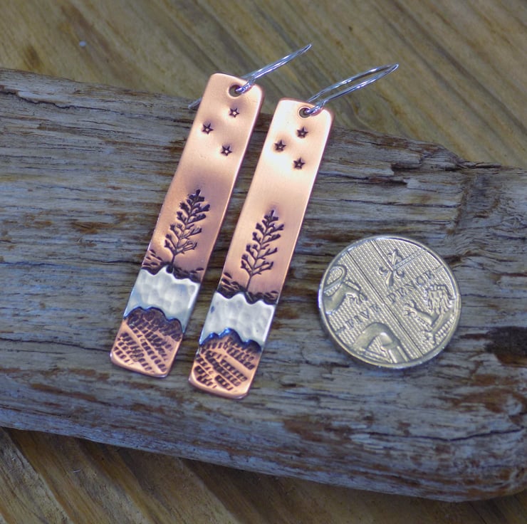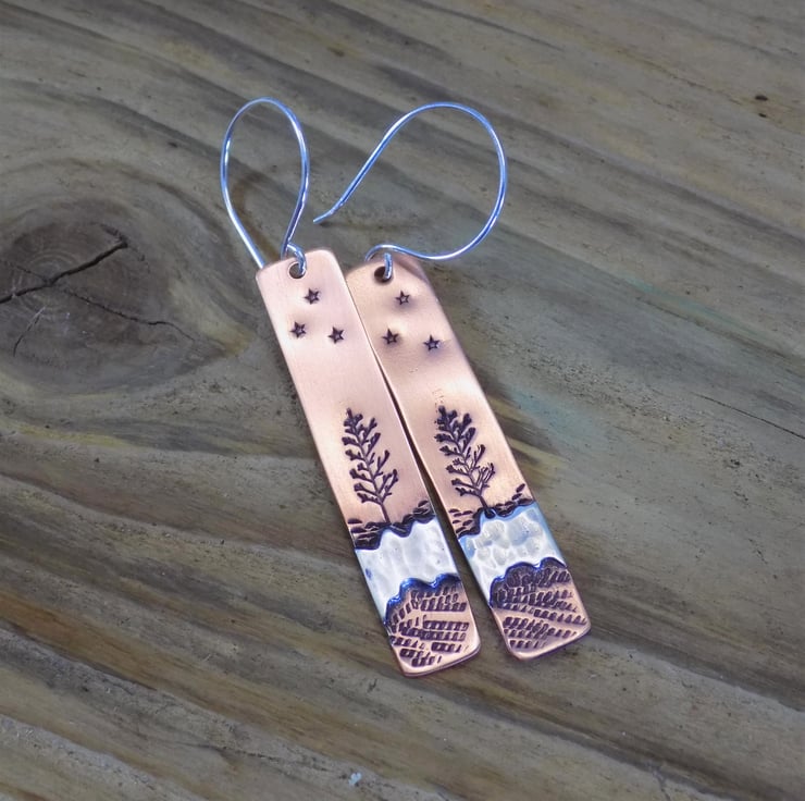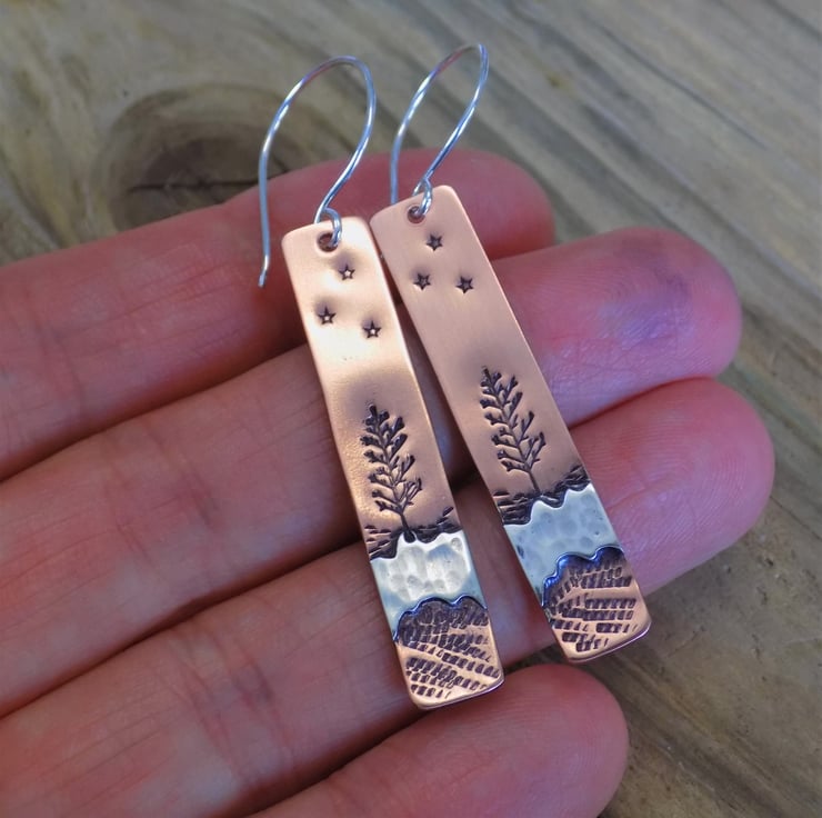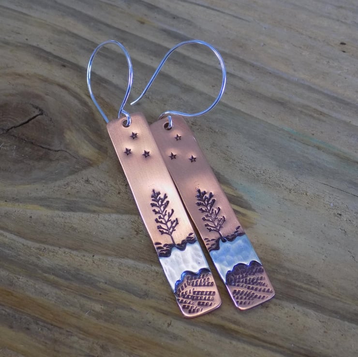 Made from copper and sterling silver. Two oblongs of copper with silver foregrounds carefully soldered on and given a dappled effect. Additional texture has been applied , stamped trees and some stars to set the scene. Hung on my own hand made 0.7 mm thick sterling silver ear wires (tumbled for strength and shine)