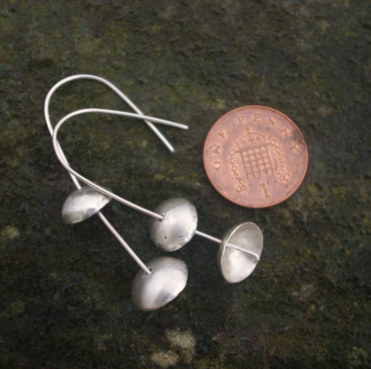 Delicate silver acorn cups ; one under the other, dangle from sterling silver ear hooks. The cup shapes move freely about; held in place by a blob of silver. The silver is from a UK eco sourced supplier.