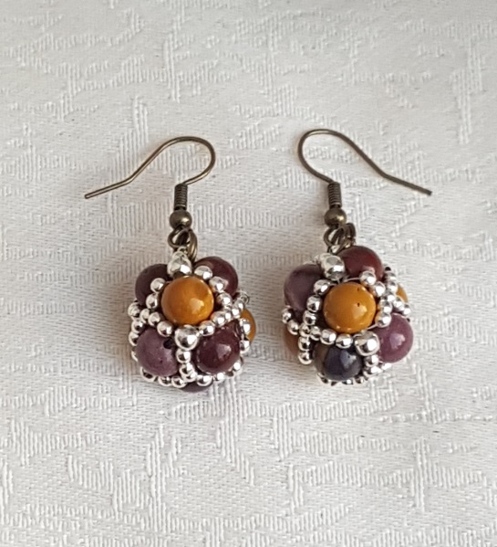 A lovely pair of unusual Mookaite earrings with Beaded Beads. The Beaded Beads are made up of round various colour Mookaite beads, surrounded by Silver Plated round beads and Antique Bronze tone Ear Wires