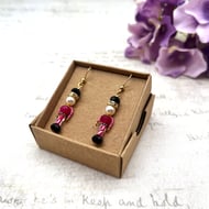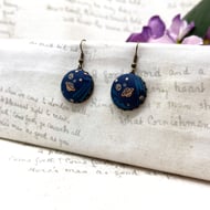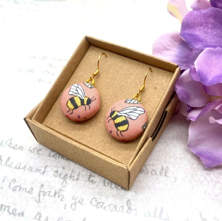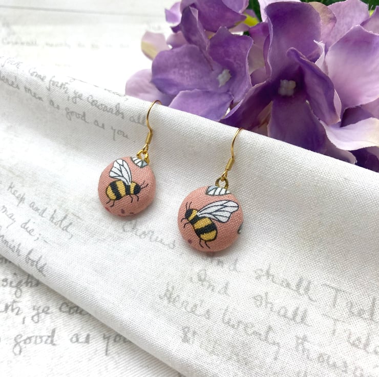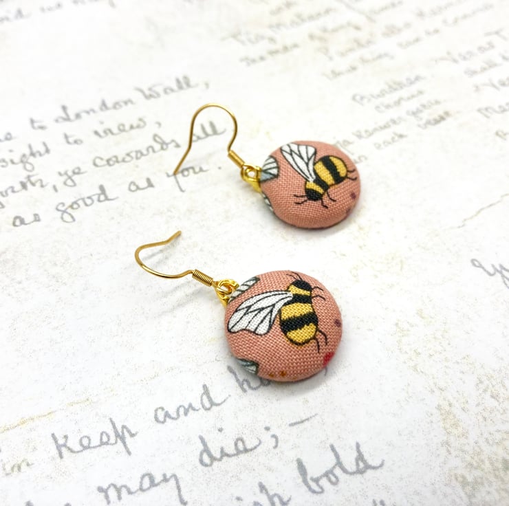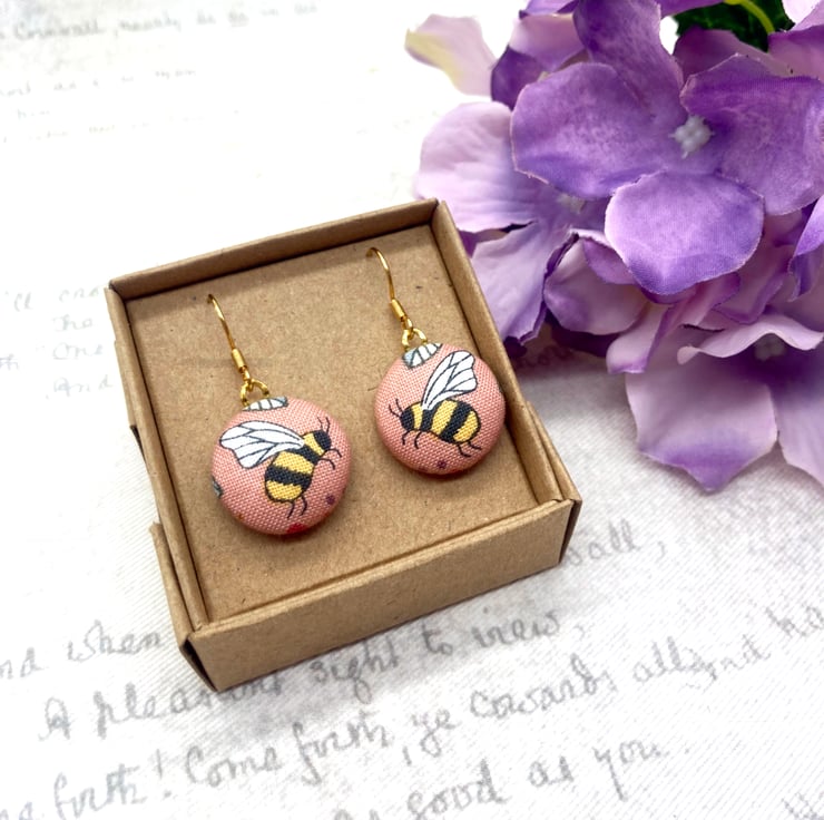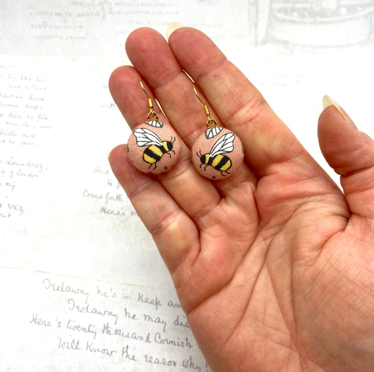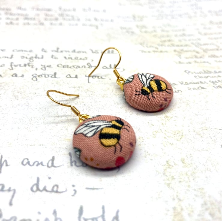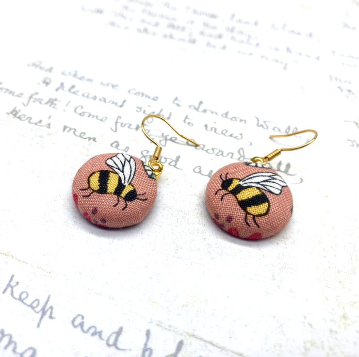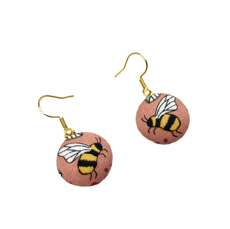 Some little buzzing bees to hang from your ears - perfect for nature lovers, these bee dangle earrings have been hand made from cotton fabric and I've turned them into buttons!