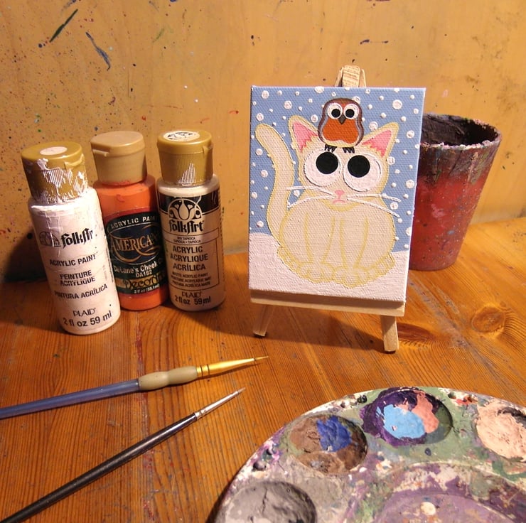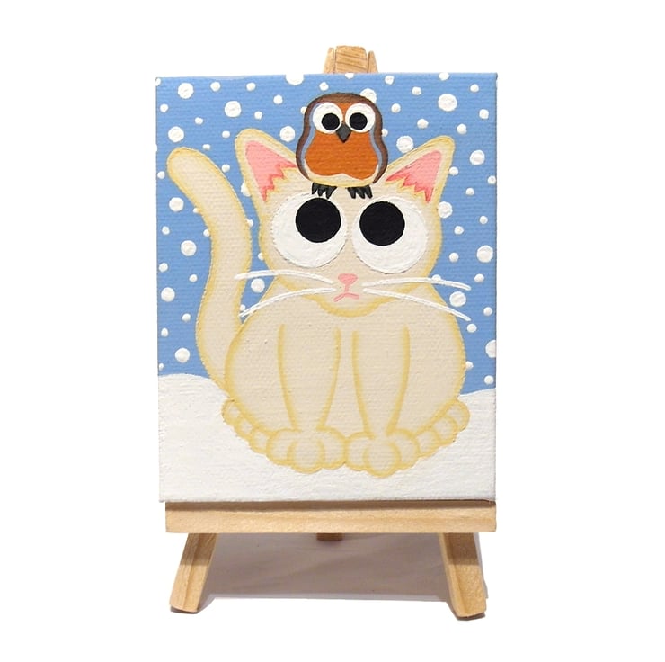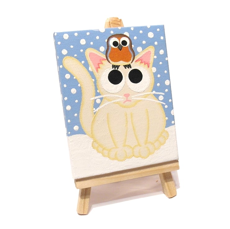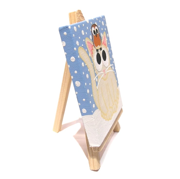 The cartoon cat and robin artwork is painted in acrylics on a mini 8cm x 10cm (3.2" x 4") canvas, and is signed and dated on the back.