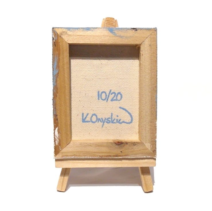 The canvas will either come with a 14cm (5.5") wooden easel for display, or will be strung with a ribbon in a colour that matches the painting so it can be hung on a wall (as in picture 9). Just choose with easel or ribbon hanging when you buy.