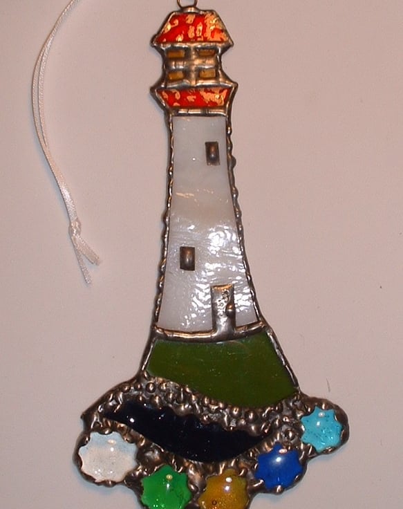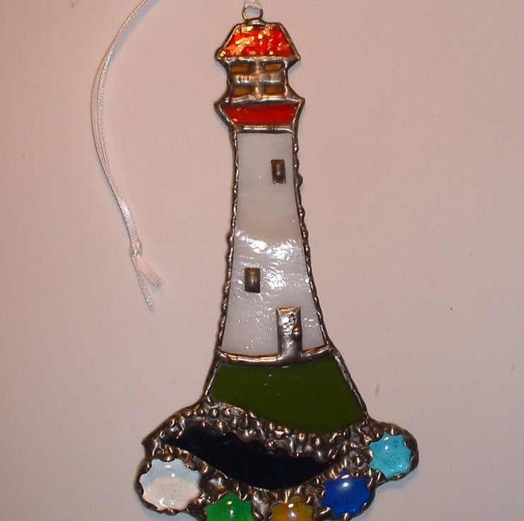 A lovely lighthouse to hang and sparkle in the sun created with white semi opaque glass, bottle green glass, deep blue, red and orange glass with multicoloured glass nuggets for extra colour and sparkle.
