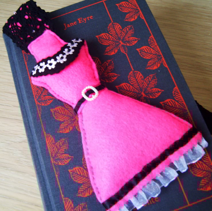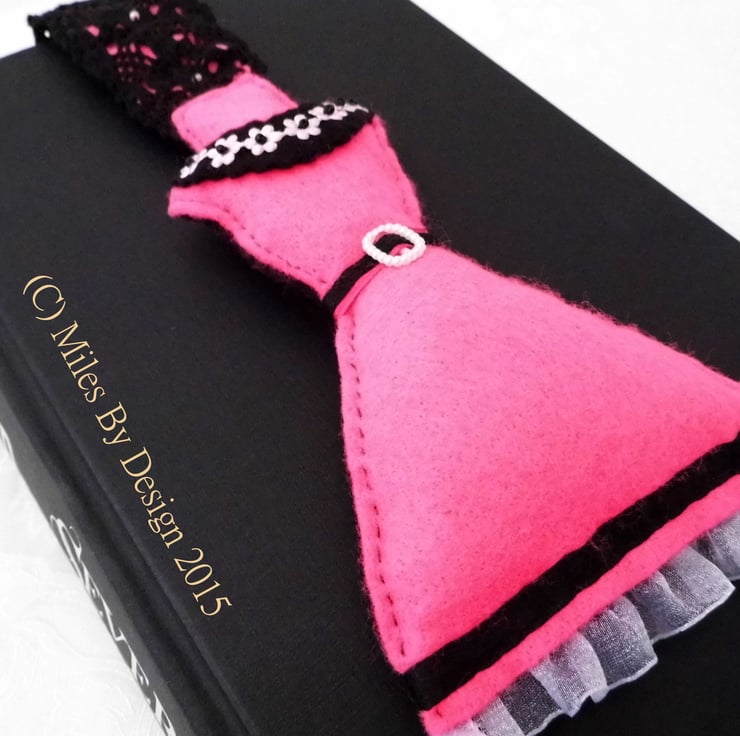 The dress is hand cut from black and pink felt and lightly padded with hollow fibre filling. It is embellished with black and white ribbon and small beads. The dress is attached to a long piece of pink felt covered with think black cotton lace and small pink seed beads to place between your pages and is all carefully hand stitched together.