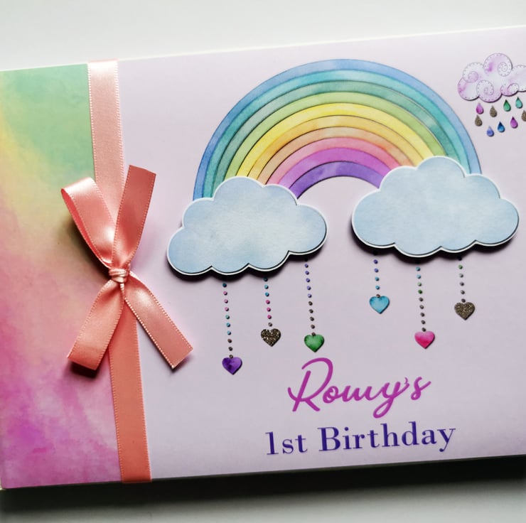 Rainbow and clouds birthday guest book, birthday party gift