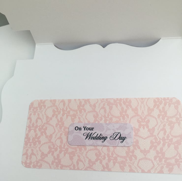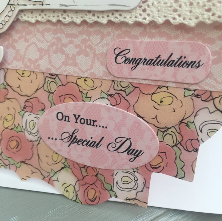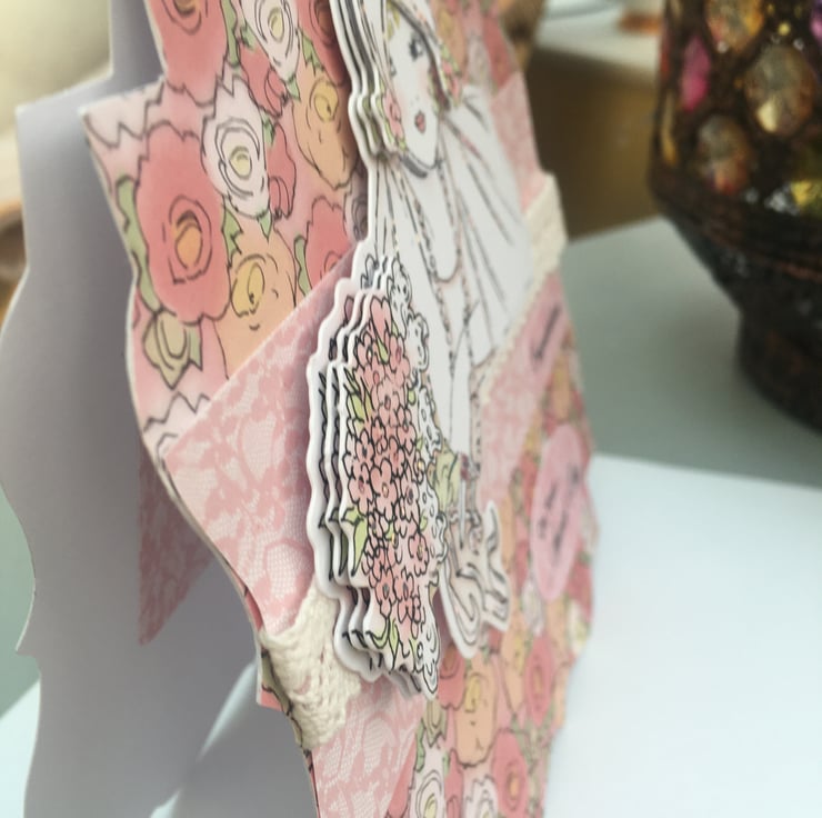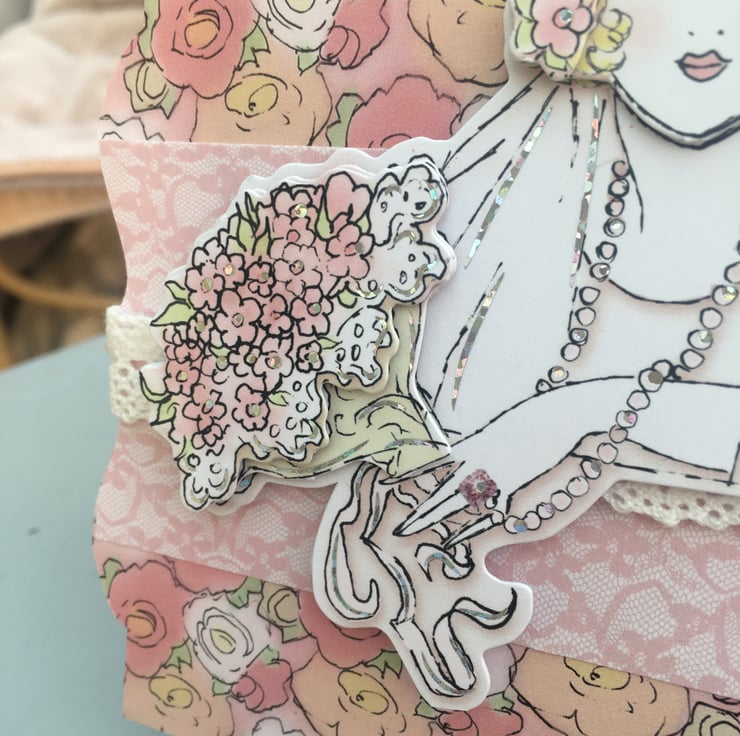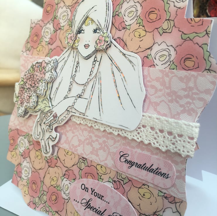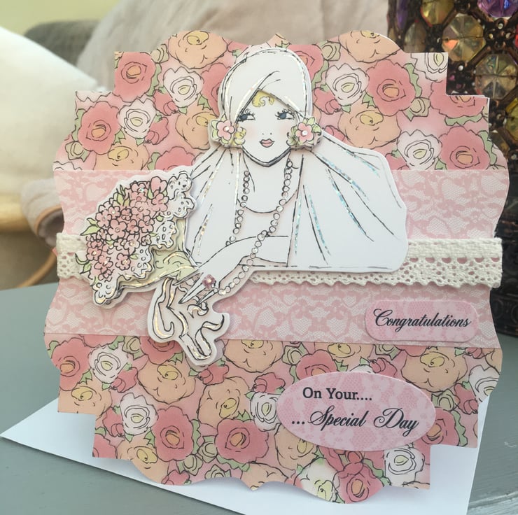 The wedding season is upon us. This intricately shaped 15x15cm card is a delicate and feminine card for any wedding. It has a fancy label shape which is covered in a fancy stylised floral paper in pinks and peaches. There is a band of pink lace effect paper across the centre which had a band of cream cocheted lace across it. The main feature is a beautiful vintage style bride holking her bouquet. She is very much in the 20's style with a cloche style veil. She has a lovely long string of pearls to finish the design. The greeting says Congratulations on your special day. Inside the card is more pink lace paper with the greeting On your wedding day. A lovely card that can be sent to the happy couple or even to the bride from perhaps her parents. The choice is yours.