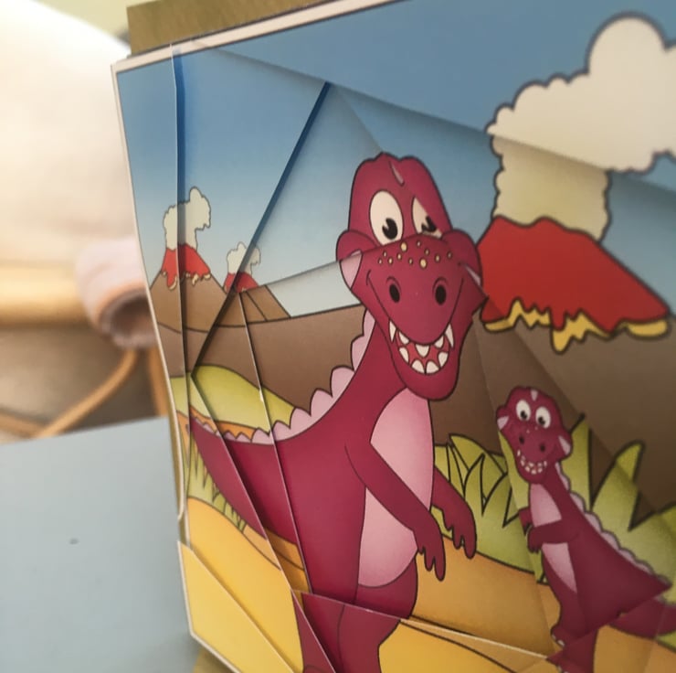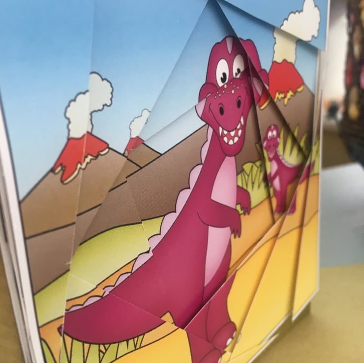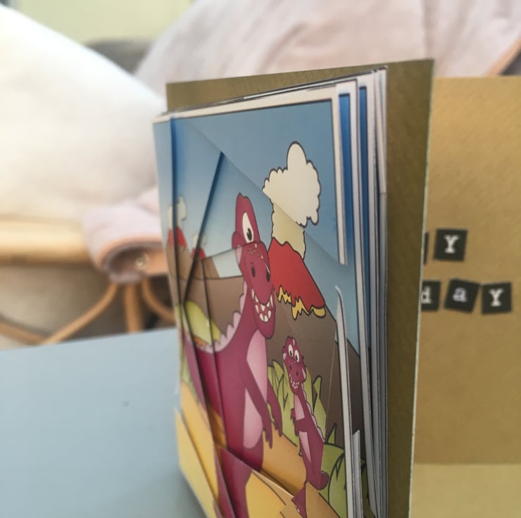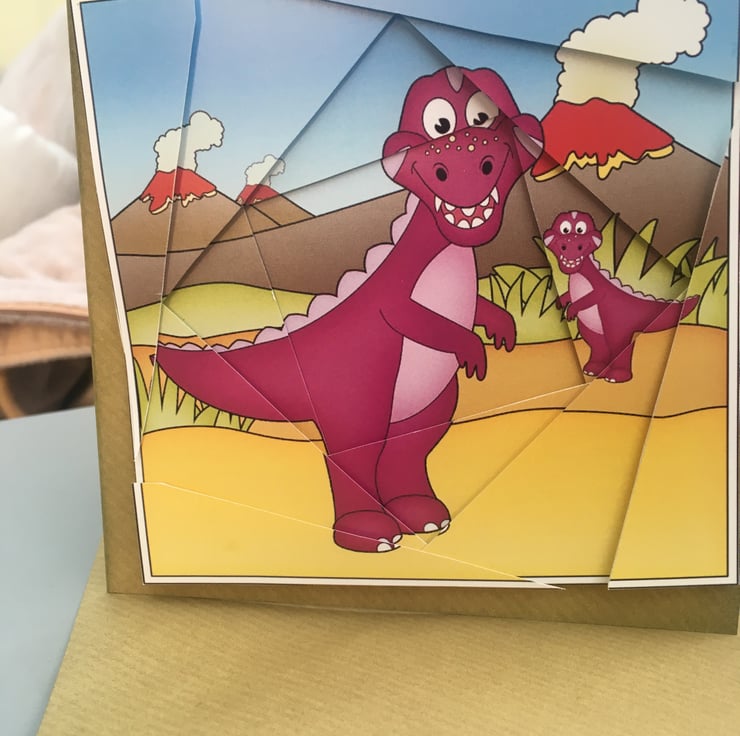 Dinosaurs - a total obsession for some children, and some adults to be fair but you just have to love this cute T-rex. He or she has athe cutest of smiles, they are standing in a prehistoric landscape of volcanos. The 12.5x12.5cm design is an unusual invertage design so you look down into it. This is definitely a birthday card for that dino enthusiast. The inside of the card says happy birthday in individual typewriter letters.