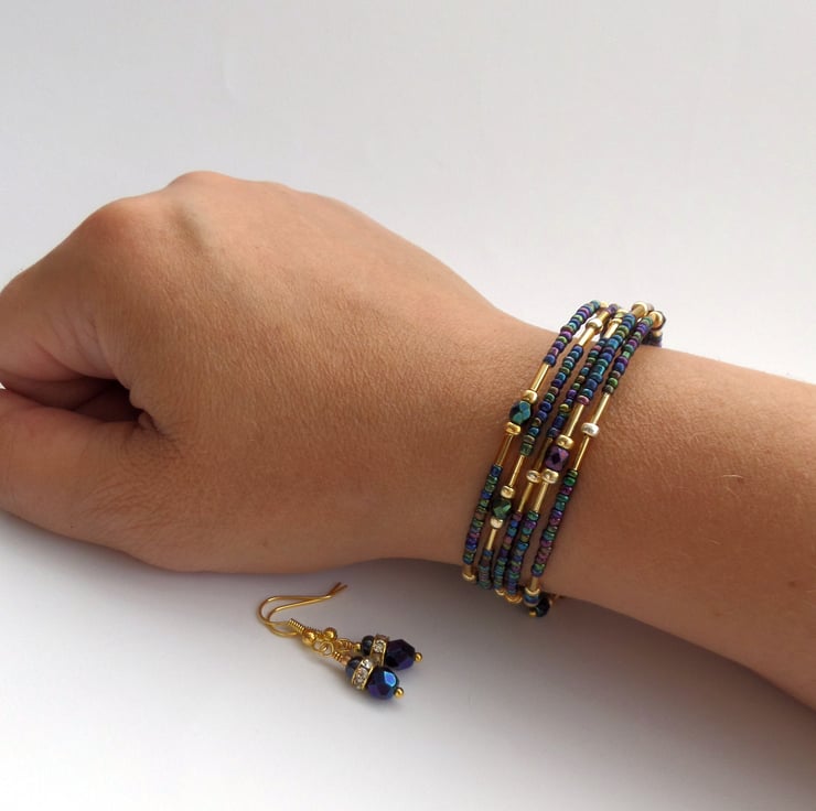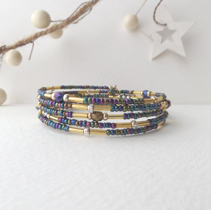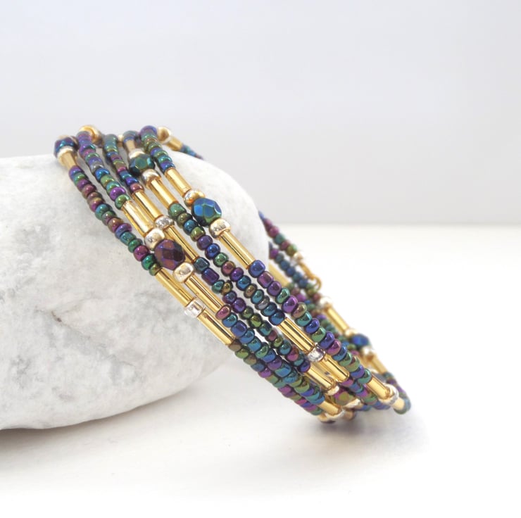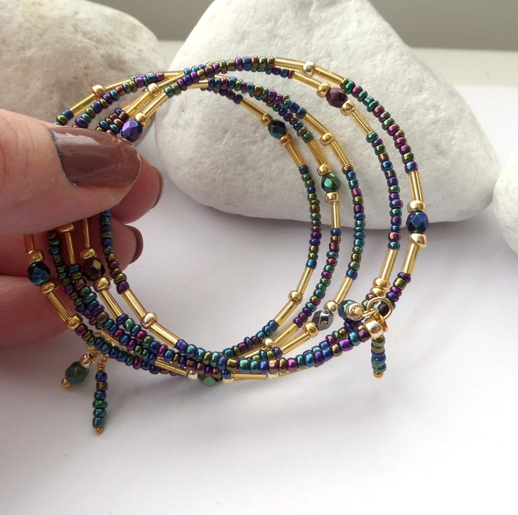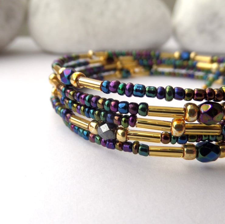 Very pretty memory bangle in quality gold, peacock blue and Czech glass beads.