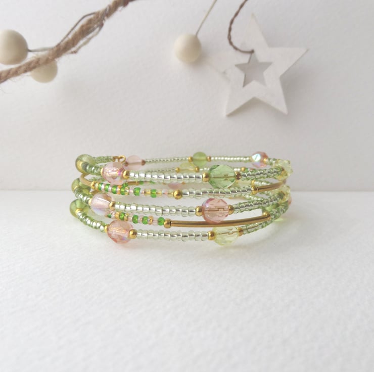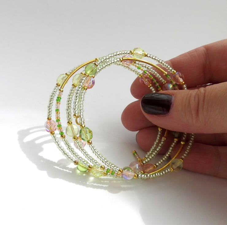 memory bangle in gold, lime and a mix of Czech glass beads.