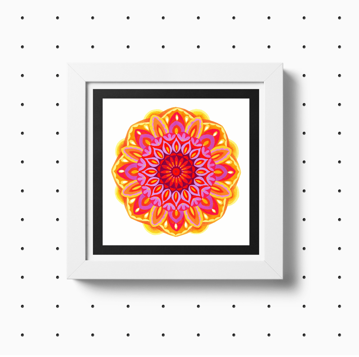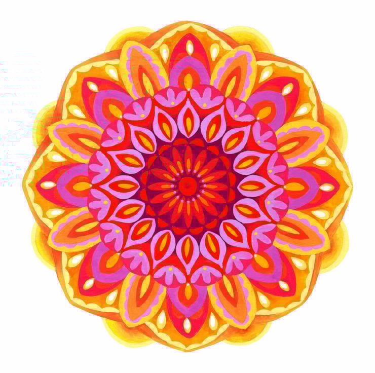 Inspired by the colours of a Sunrise this is a print from an original watercolour and gouache mandala painting