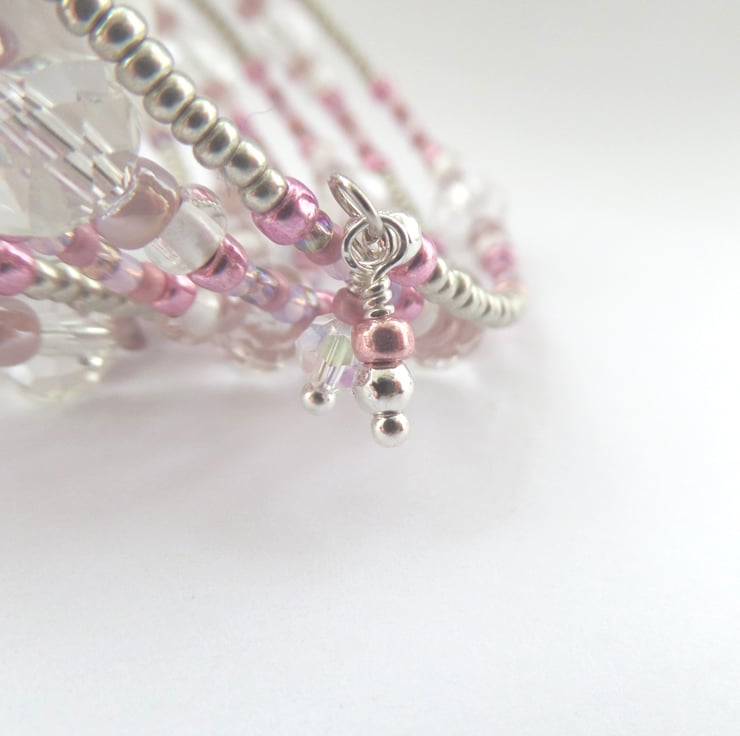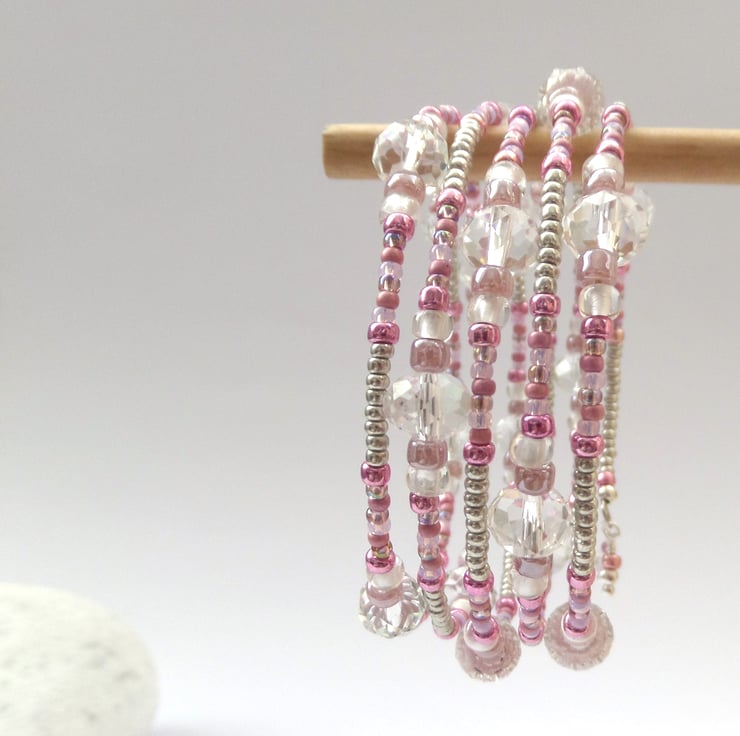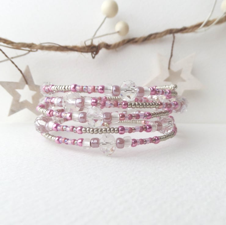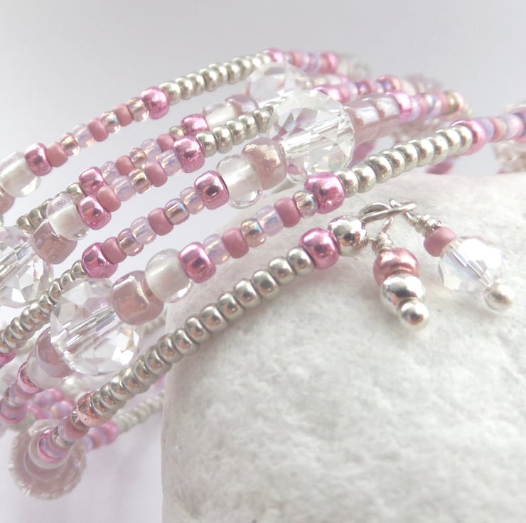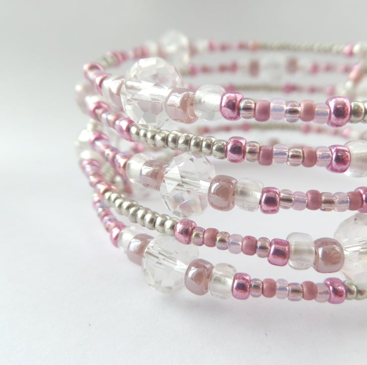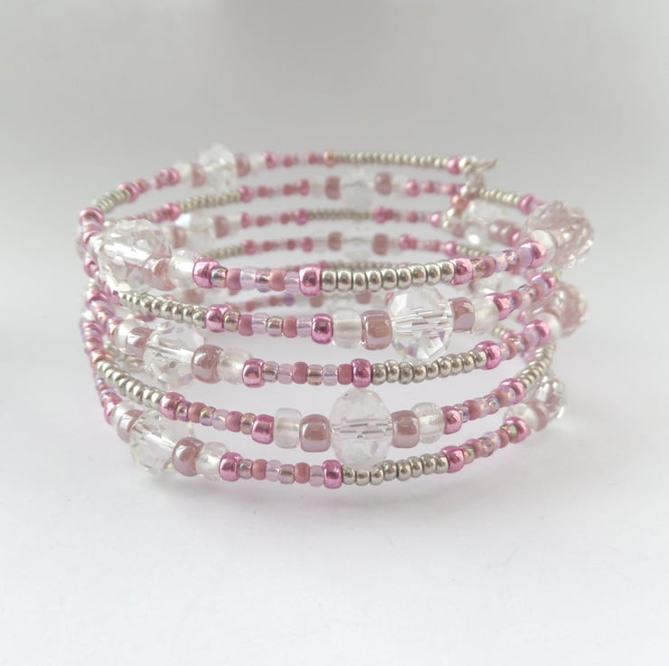 Very pretty, wide, memory bangle in pink, grey and hints of mauve and lilac, big clear crystals and accented with silver.
