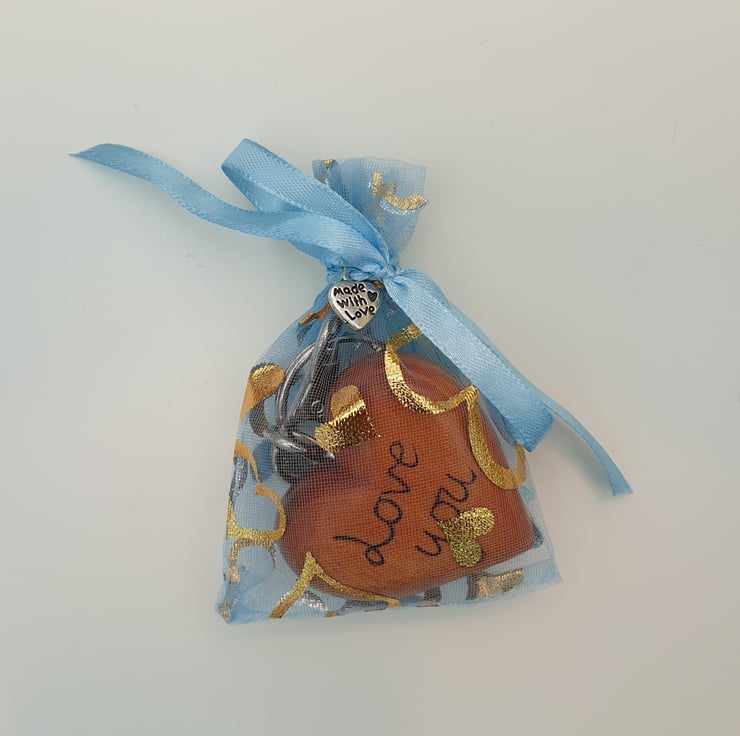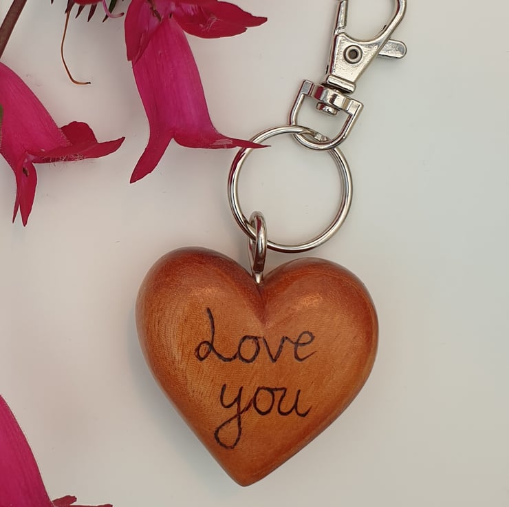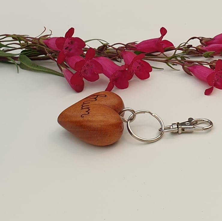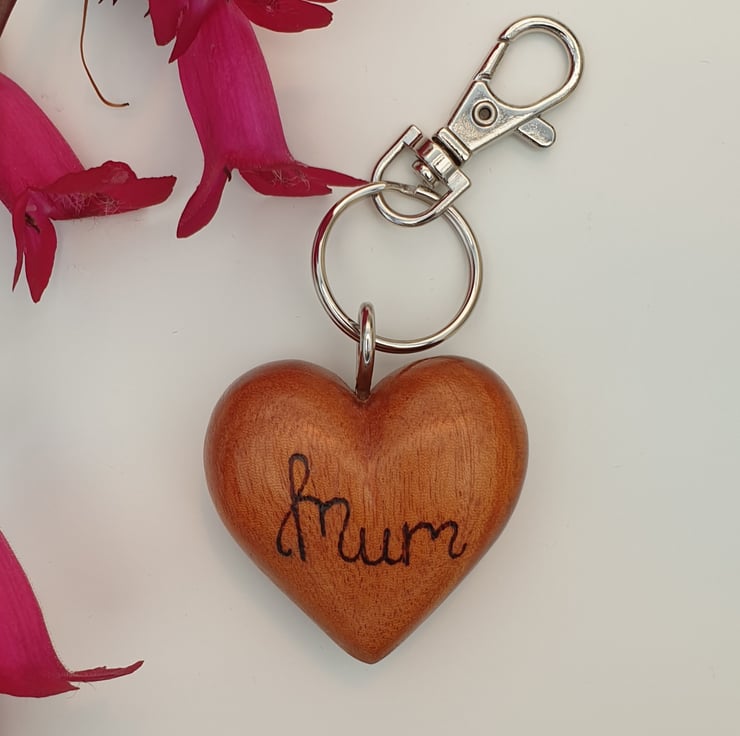 Gorgeous wooden heart keyring just for mum made from solid beech. One side of the wooden heart has been handburnt using the art of pyrography with the word 'mum' and the other side woodburned with the words 'love you'. This lovely quality heart has then been varnished to protect it. There is a metal loop in the top of the heart and a lobster clasp keychain attached.