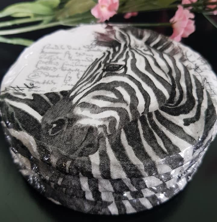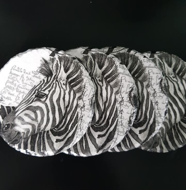 4 Zebra slate coasters, these coasters are designed using the decoupage napkin technique. Finished with a high quality heavy duty varnish, which makes them suitable for all hot and cold drinks.