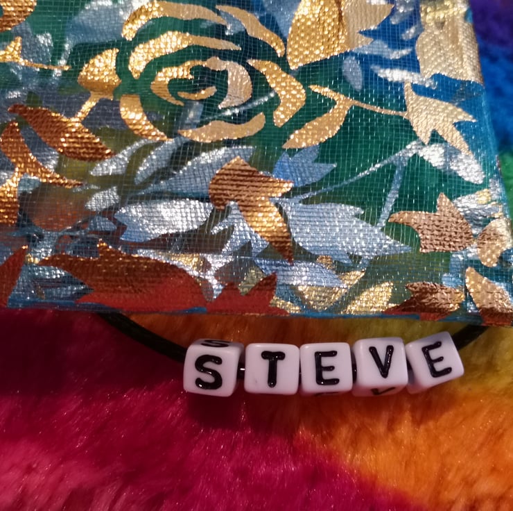 These are white acrylic beads with black letters, they are on a waxed cord finished with a lobster clasp and exstenion chain