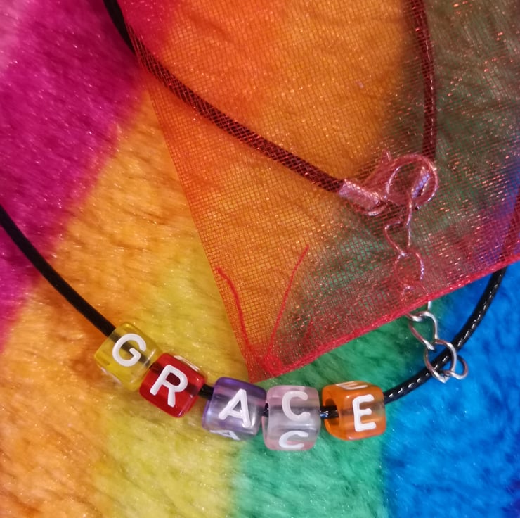 These acrylic beads are colourful and see through the letters are all white, they are on a waxed cord finished with a lobster clasp and exstenion chain