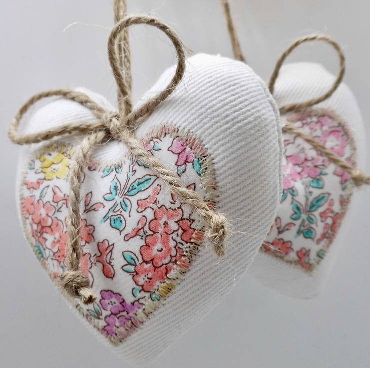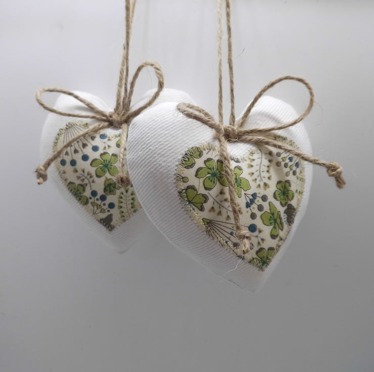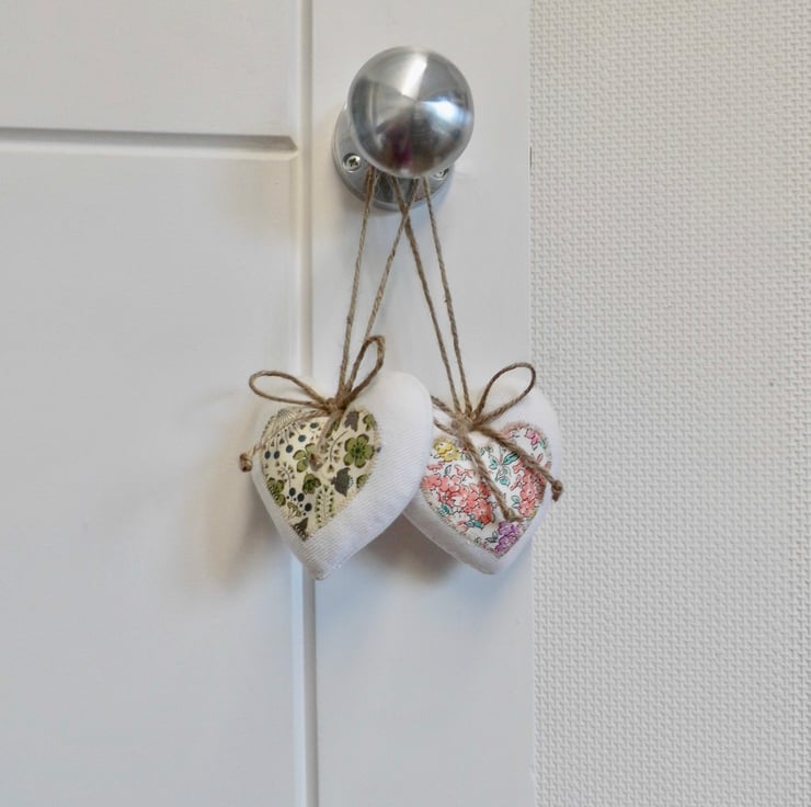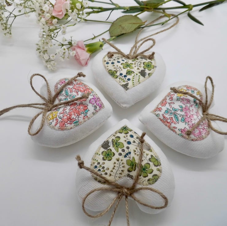 Each one is carefully made using white cotton twill fabric and appliquéd with a heart shape of beautiful floral Liberty Tana lawn. Two in matching pink, two in matching green.