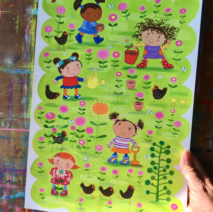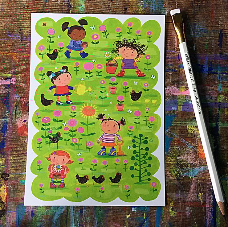 This print is from an illustration in my portfolio, and was the inspiration for one of my children's books. It shows little girls having fun in the garden, and one of them is based on my daughter.