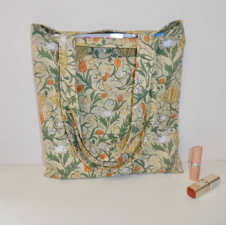 I made this tote bag using a mid-weight cotton fabric called Wild Tulip which has a beige background and an art nouveau style print of yellow, orange and green. I faced the top of the bag with the same fabric for a professional finish and then lined the lower half with a cream cotton lining fabric. I inserted a key ring into one of the side seams, useful for clipping your keys or the included purse.