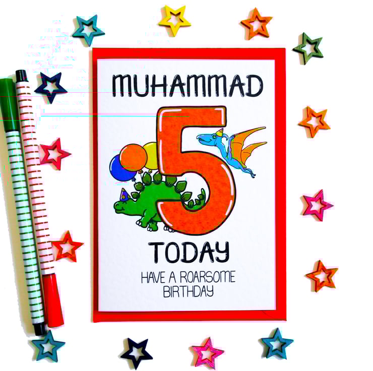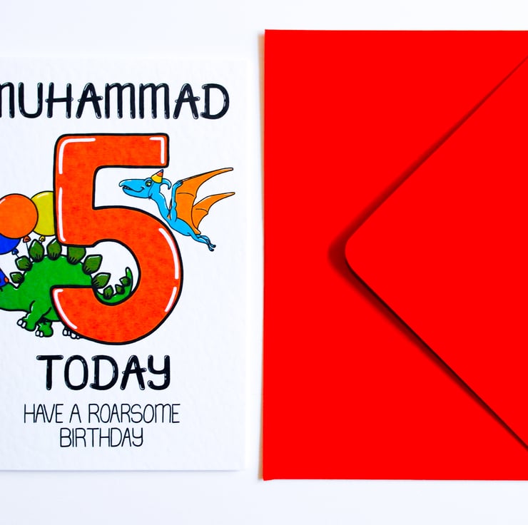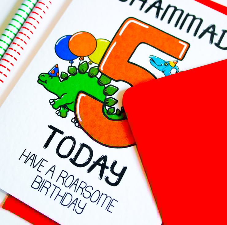 Greeting on front: (name) 5 TODAY HAVE A ROARSOME BIRTHDAY