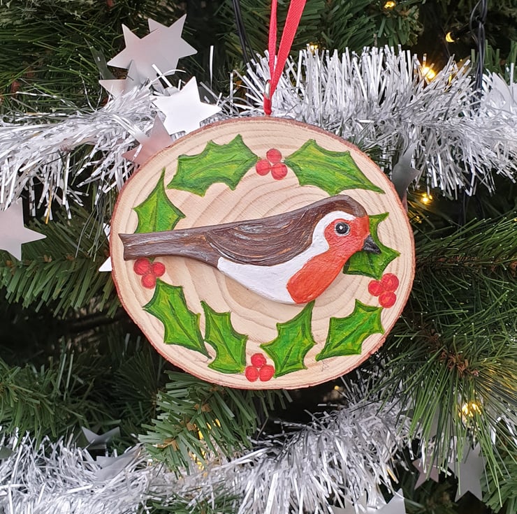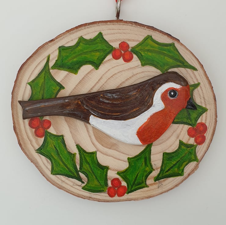 This cheerful Christmas robin wood slice would make a lovely addition to your Christmas decor. The robin has been lovingly handmade from clay, hand painted with acrylics and varnished. The robin has then been added to a log slice which has been handpainted with holly and varnished. The decoration has a metal hanging hoop, silver in colour, screwed into the top of the wood slice and is finished with red ribbon for hanging.