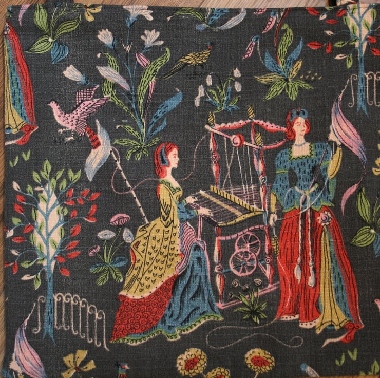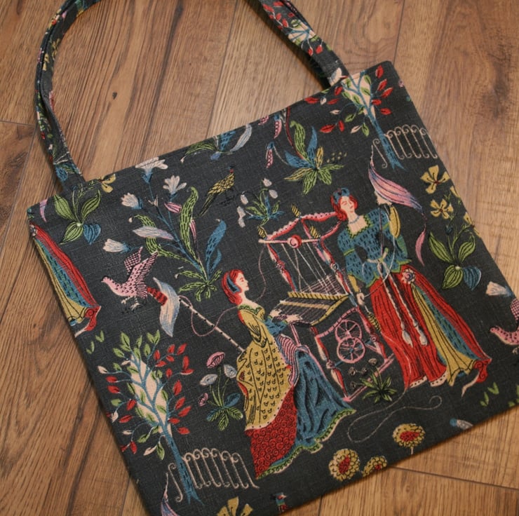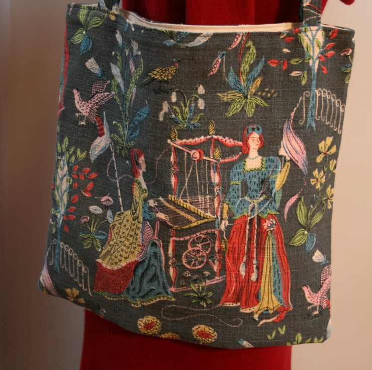 Shown on an adult-size mannequin for scale, this shopping bag is large and practical, with a lovely but unusual pattern - it features two ladies, one seated at a floor loom weaving, and the other spinning using a drop spindle and distaff.
