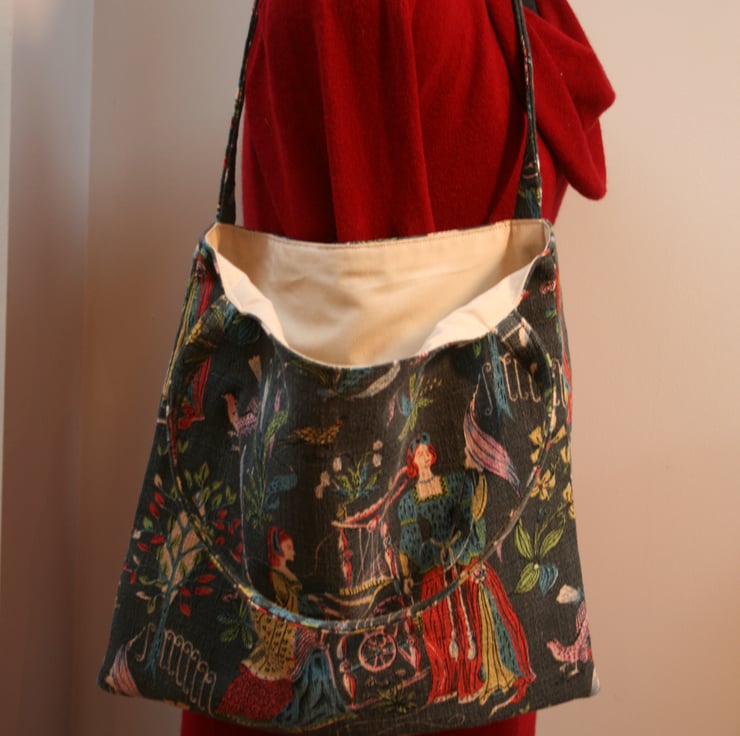 This is a lovely vintage fabric, originally a pair of curtains, which has been upcycled in to a sturdy shopping bag with two handles and fully lined. Very useful!