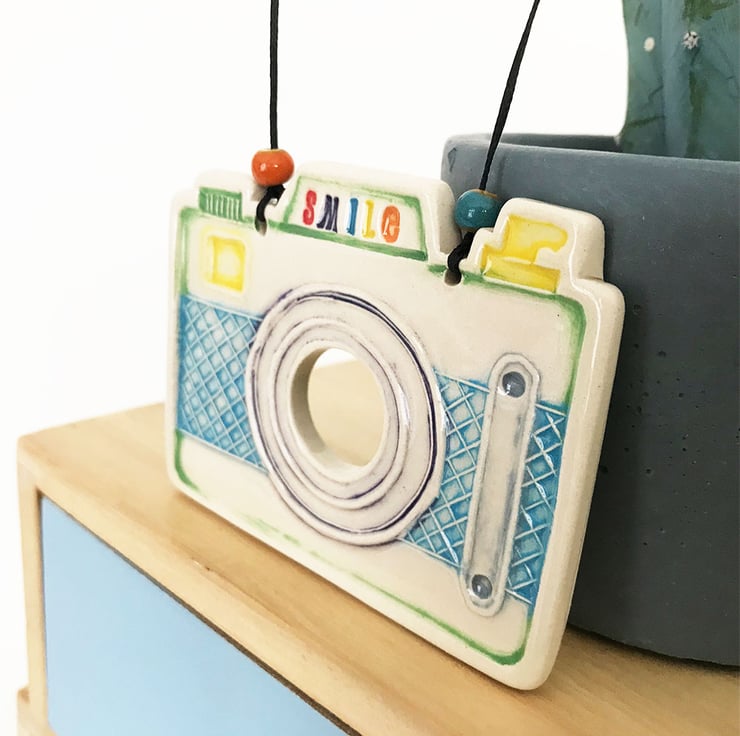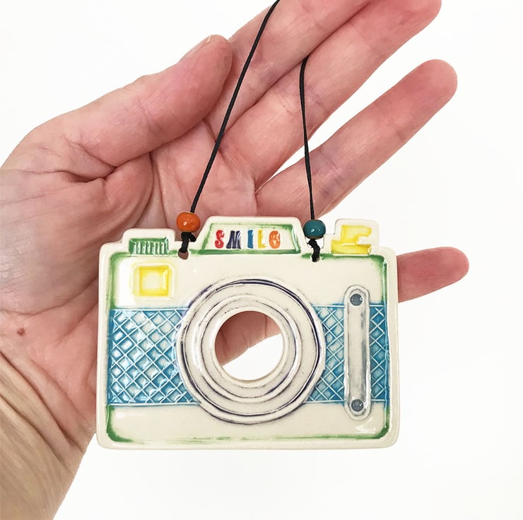 This little pottery camera has been hand-cut and stamped from my own design. It is made from white earthenware clay, decorated and fired. It has then been glazed with a lovely glossy glaze and fired again to 1100 degrees. It hangs from a black string. 8cm wide x 6.5cm high x 0.8cm deep. This item is a second because it has warped out of shape and the colours are not as neat as I would normally like. RRP £9 - seconds price £4
