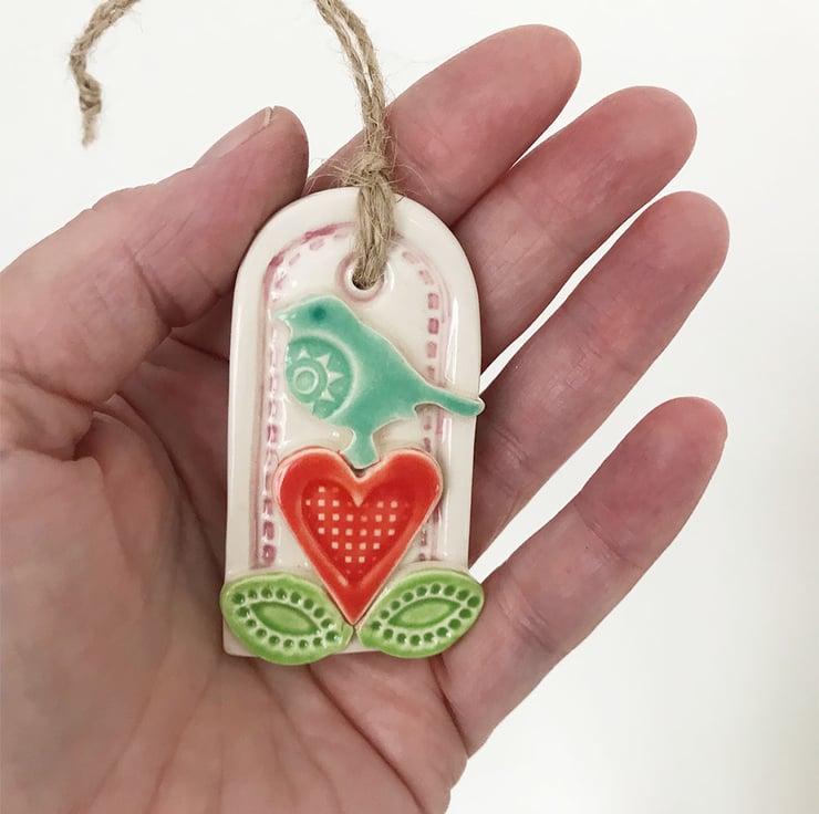 This ceramic gift tag decoration is made from white earthenware clay and decorated with a little flower and bird design. It has been fired twice and finished with a glossy glaze for a lovely smooth finish. It measures 6cm x 3cm x 1cm deep and hangs from a rustic brown string..This is a second because the decoration is not as neat as I would like. RRP £6 - sale price £3