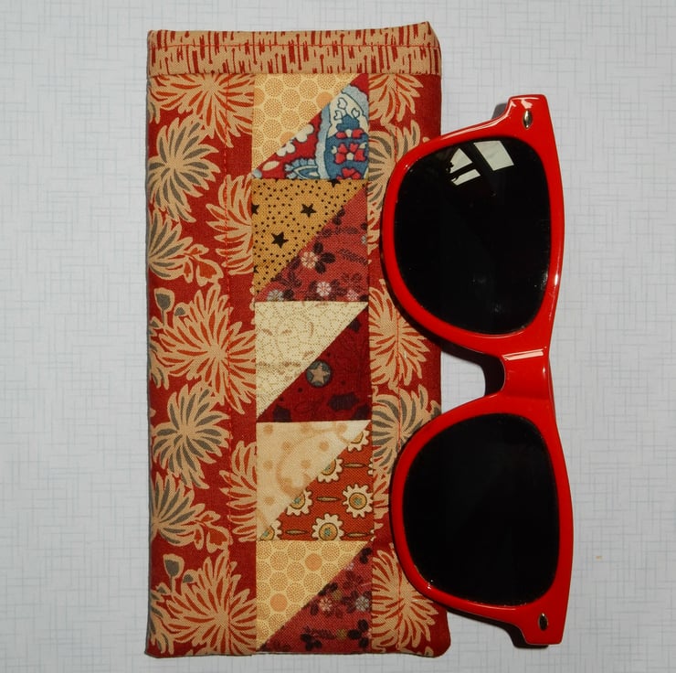 This is an attractive patchwork and floral case for your glasses or sunglasses. It is made from a cotton print fabric with a panel of patchwork triangles on the front and back and a toning print lining and trim. It also has a layer of wadding for protection. This is a slip in style glasses case, if you require a case which fastens please view my other listings.