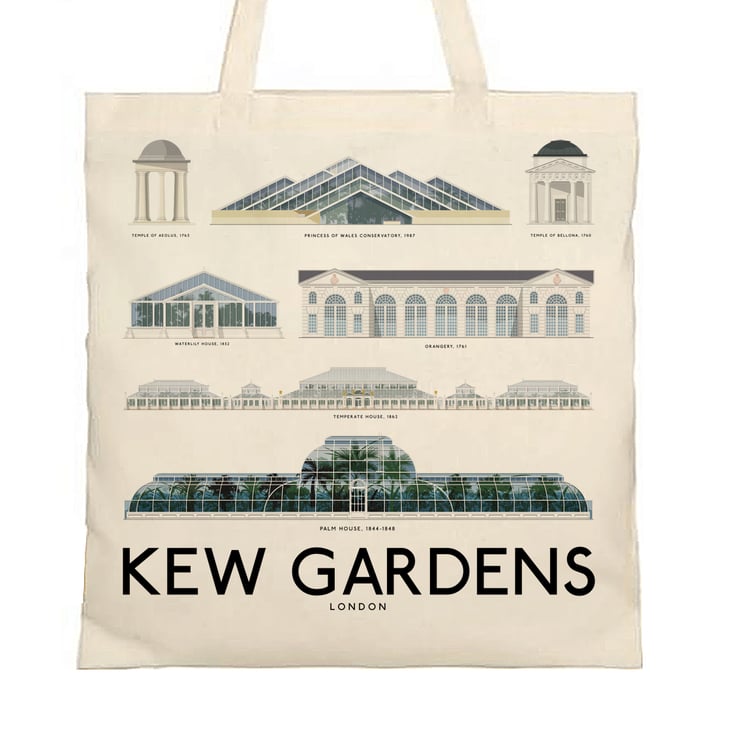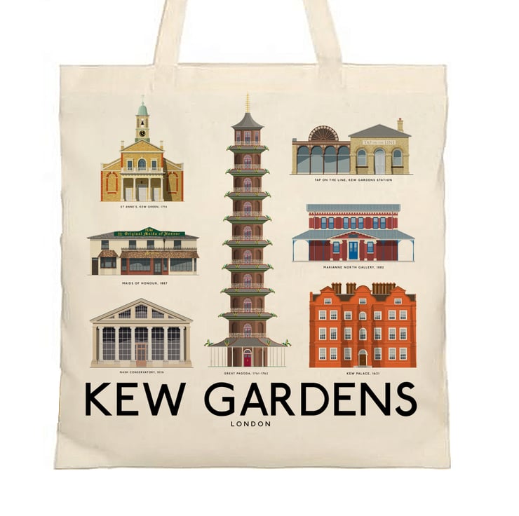 The 'Kew Gardens' cotton shopping bag measures 45cm wide x 40cm tall with 60cm handles. Different design each side. Features the famous and historical buildings found in and around Kew Gardens