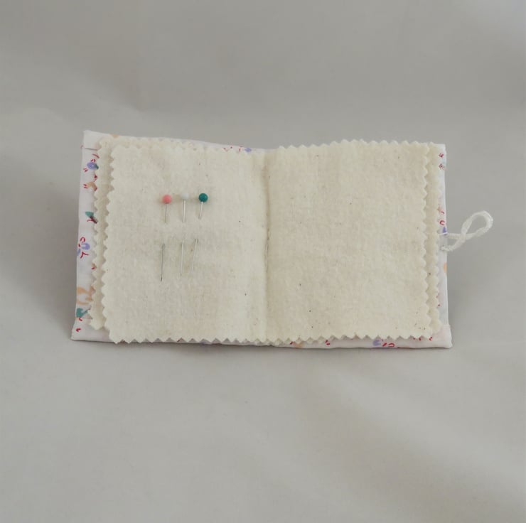 The needle book is lined in a pink and lilac print fabric - backed with fusible interfacing, and closes with a button hole stitch loop over a vintage, pink button. Two pieces of vintage, unused flannelette, from my Grandmother's 'bottom drawer', provide four 'pages' for your pins and needles.