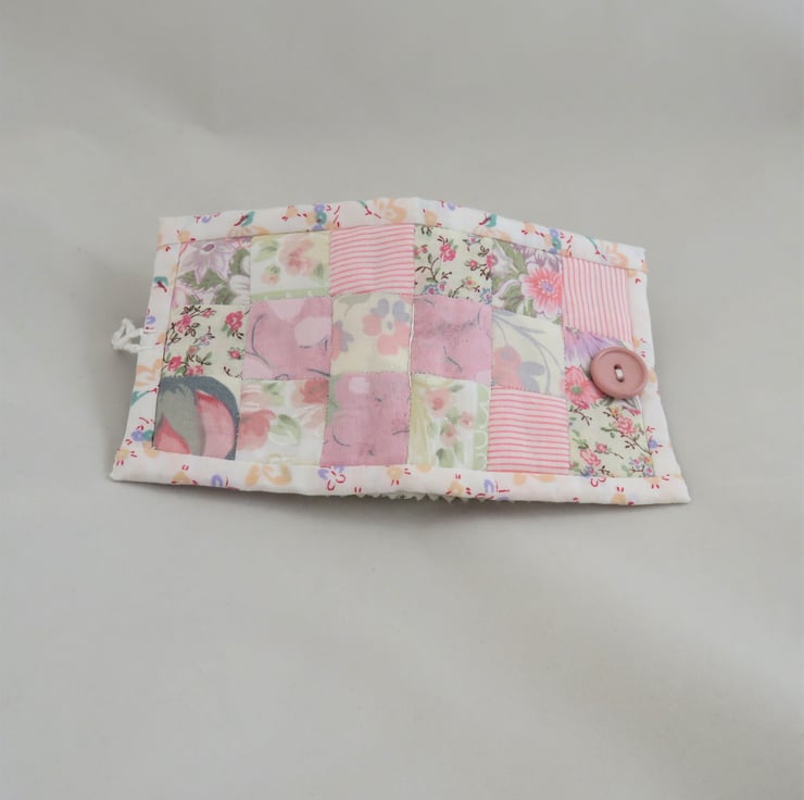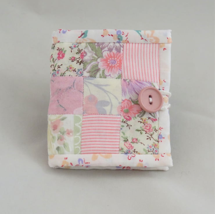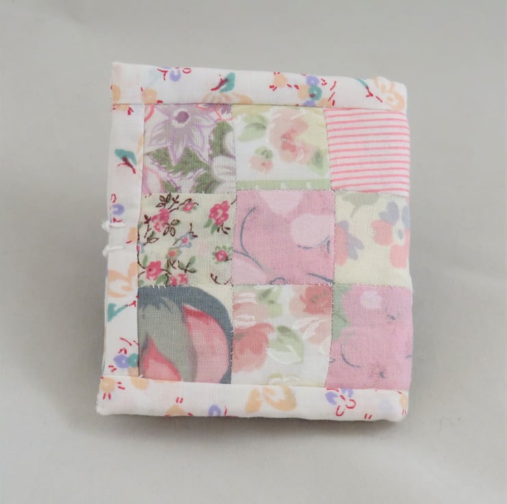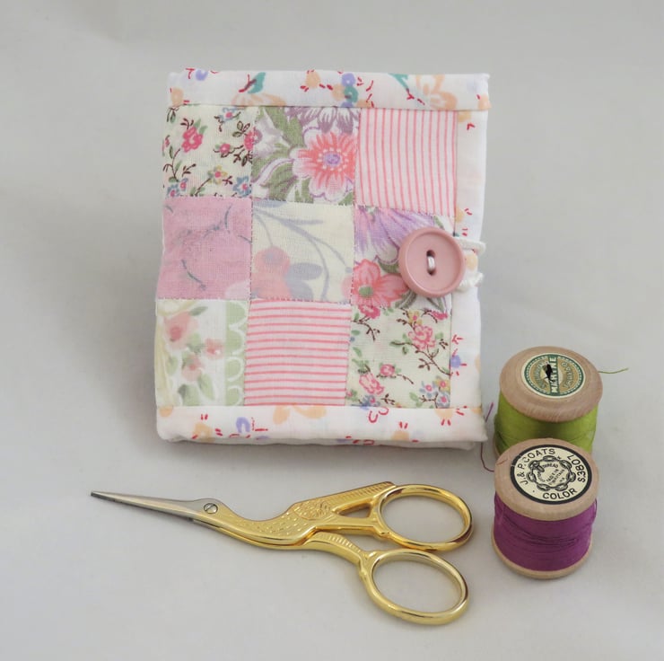 A portion of pretty patchwork, hand stitched by the 'english paper piecing' method forms the cover for this needle book. The fabrics chosen are mostly vintage and either offcuts from previous projects or reclaimed from summer garments or curtains.The cover is backed with an offcut of unused fleece fabric. The edges of the cover are bound with a strips of fabric from my stash (this one approx 20 years old!)