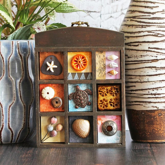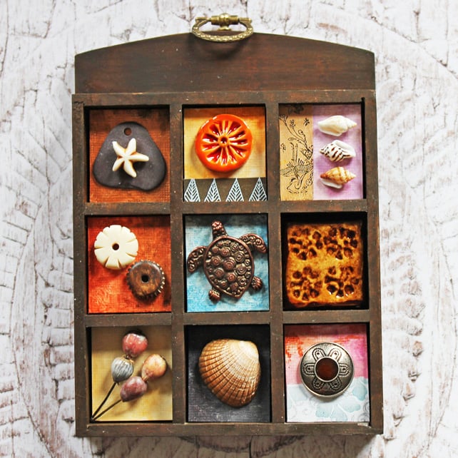 A vintage thimble rack has been given a new lease of life and filled with an assortment of 'treasures' including shells, debossed and painted polymer clay, bone beads, dried seed pods, a pretty vintage button and a Greek Mykonos metal turtle.